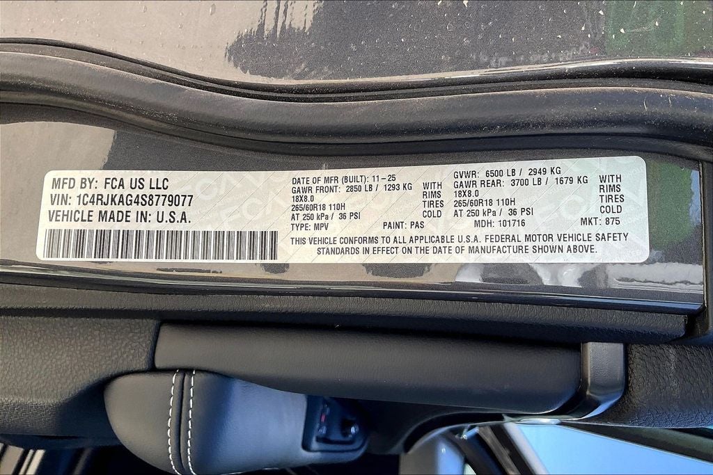 This 2025 Jeep Grand Cherokee L Altitude X in Baltic Gray Metallic Clearcoat comes with the following features: 3.6L V6 24V VVT 8-Speed Automatic 4WD Quick Order Package 23M Altitude X (115V Auxiliary Power Outlet, 3rd Row Charge-Only USB Ports, Altitude X, Black Headliner, Capri Leatherette/Suede Seats, Delete Laredo Badge, Gloss Black Exterior Accents, Heated Front Seats, Heated Steering Wheel, Power Liftgate, Power Sunroof, Rain Sensitive Windshield Wipers, Remote Start System, Selectable Tire Fill Alert, Wheels: 18 x 8.0 Fully Painted Aluminum 1, and Wireless Charging Pad), 3.45 Rear Axle Ratio, 3rd row seats: split-bench, 4-Wheel Disc Brakes, 6 Speakers, ABS brakes, Air Conditioning, Alloy wheels, AM/FM radio: SiriusXM, Anti-whiplash front head restraints, Automatic temperature control, Brake assist, Bumpers: body-color, Cloth Seats, Compass, Delay-off headlights, Driver door bin, Driver vanity mirror, Dual front impact airbags, Dual front side impact airbags, Electronic Stability Control, Emergency communication system, Four wheel independent suspension, Front anti-roll bar, Front Bucket Seats, Front Center Armrest w/Storage, Front dual zone A/C, Front License Plate Bracket, Front reading lights, Fully automatic headlights, Heated door mirrors, Illuminated entry, Knee airbag, Low tire pressure warning, Manual Fold Seatbacks, Model Year Tracking, Normal Duty Suspension, Occupant sensing airbag, Outside temperature display, Overhead airbag, Overhead console, Panic alarm, ParkView Rear Back-Up Camera, Passenger door bin, Passenger vanity mirror, Power door mirrors, Power driver seat, Power steering, Power windows, Radio data system, Radio: Uconnect 5 with 8.4 Display, Rear air conditioning, Rear anti-roll bar, Rear reading lights, Rear window defroster, Rear window wiper, Reclining 3rd row seat, Remote keyless entry, Security system, Speed control, Speed-Sensitive Wipers, Split folding rear seat, Spoiler, Steering wheel mounted audio controls, Tachometer, Telescoping steering wheel, Tilt steering wheel, Traction control, Trip computer, Variably intermittent wipers, Voltmeter, and Wheels: 18 x 8.0 Fully Painted Aluminum.