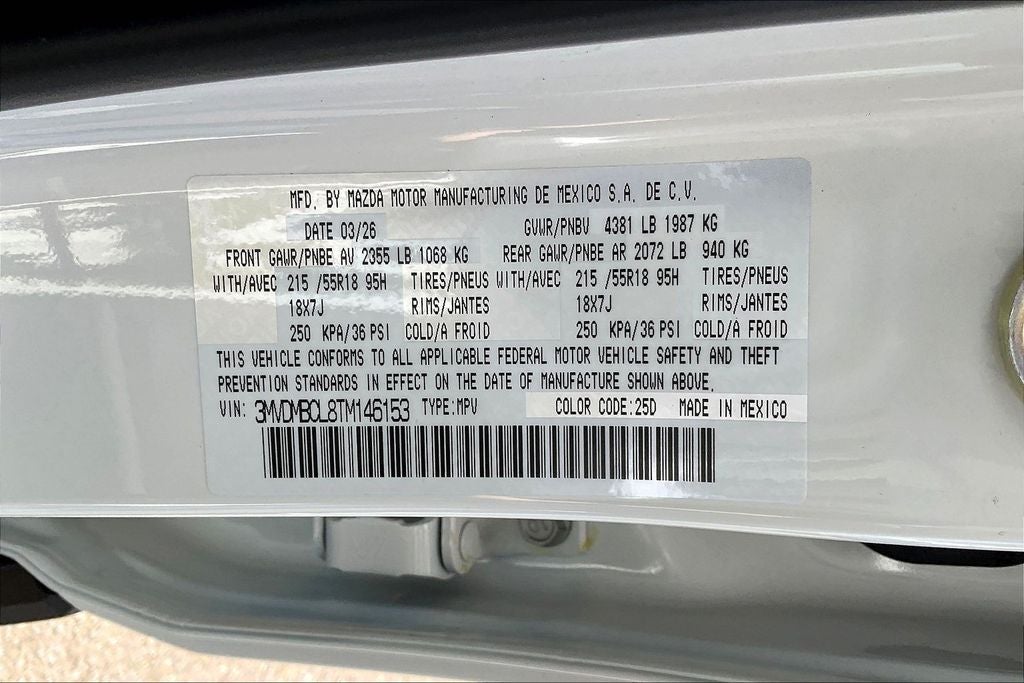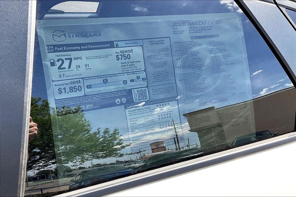 This 2026 Mazda CX-30 2.5 S Preferred in Snowflake White Pearl Mica comes with the following features: SKYACTIV®-G 2.5L 4-Cylinder DOHC 16V 6-Speed Automatic AWD 4-Wheel Disc Brakes, 8 Speakers, ABS brakes, Air Conditioning, Alloy wheels, AM/FM radio, AppLink/Apple CarPlay and Android Auto, Auto High-beam Headlights, Automatic temperature control, Brake assist, Bumpers: body-color, Cargo Tray, Compass, Delay-off headlights, Driver door bin, Driver vanity mirror, Dual front impact airbags, Dual front side impact airbags, Electronic Stability Control, Emergency communication system: MAZDA CONNECT, Exterior Parking Camera Rear, Front anti-roll bar, Front Bucket Seats, Front Center Armrest, Front dual zone A/C, Front reading lights, Front wheel independent suspension, Fully automatic headlights, Heated door mirrors, Heated Front Bucket Seats, Heated front seats, High Wall All-Weather Floor Mats, Illuminated entry, Knee airbag, Leather Shift Knob, Leather steering wheel, Leatherette Seat Trim, Low tire pressure warning, Machine Gray Metallic Paint Charge, MAZDA CONNECT Infotainment System, Memory seat, Occupant sensing airbag, Outside temperature display, Overhead airbag, Overhead console, Panic alarm, Passenger door bin, Passenger vanity mirror, Power door mirrors, Power driver seat, Power moonroof, Power steering, Power windows, Radio data system, Radio: AM/FM Audio System, Rain sensing wipers, Rear seat center armrest, Rear side impact airbag, Rear window defroster, Rear window wiper, Remote keyless entry, Snowflake White Pearl Mica Paint Charge, Speed control, Speed-sensing steering, Split folding rear seat, Spoiler, Stainless Steel Rear Bumper Guard, Steering wheel mounted audio controls, Tachometer, Telescoping steering wheel, Tilt steering wheel, Traction control, Trip computer, Turn signal indicator mirrors, Variably intermittent wipers, Wheel Locks, and Wheels: 18 x 7J Aluminum Alloy. Price includes: $2000 - Customer Cash. Exp. 04/30/2026