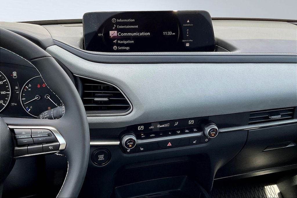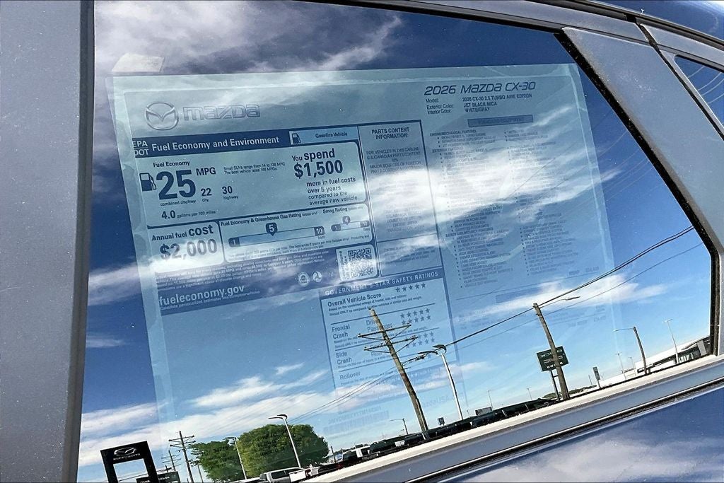 This 2026 Mazda CX-30 2.5 Turbo Aire Edition in Jet Black Mica comes with the following features: 2.5L I4 6-Speed Automatic AWD 12 Speakers, 4-Wheel Disc Brakes, ABS brakes, Air Conditioning, Alloy wheels, AM/FM radio, AppLink/Apple CarPlay and Android Auto, Auto High-beam Headlights, Auto-dimming Rear-View mirror, Automatic temperature control, Black Lug Nuts & Black Wheel Locks, Brake assist, Bumpers: body-color, Cargo Cover, Cargo Tray, Compass, Delay-off headlights, Driver door bin, Driver vanity mirror, Dual front impact airbags, Dual front side impact airbags, Electronic Stability Control, Emergency communication system: MAZDA CONNECT, Exterior Parking Camera Rear, Front anti-roll bar, Front Bucket Seats, Front Center Armrest, Front dual zone A/C, Front reading lights, Front wheel independent suspension, Fully automatic headlights, Garage door transmitter: HomeLink, Heads-Up Display, Heated door mirrors, Heated Front Bucket Seats, Heated front seats, High Wall All-Weather Floor Mats, Illuminated entry, Knee airbag, Leather Shift Knob, Leather steering wheel, Leatherette Seat Trim, Low tire pressure warning, MAZDA CONNECT Infotainment System, Memory seat, Occupant sensing airbag, Outside temperature display, Overhead airbag, Overhead console, Panic alarm, Passenger door bin, Passenger vanity mirror, Power door mirrors, Power driver seat, Power Liftgate, Power moonroof, Power steering, Power windows, Radio data system, Radio: AM/FM/HD Audio System, Rain sensing wipers, Rear seat center armrest, Rear side impact airbag, Rear window defroster, Rear window wiper, Remote keyless entry, Speed control, Speed-sensing steering, Split folding rear seat, Spoiler, Steering wheel mounted audio controls, Tachometer, Telescoping steering wheel, Tilt steering wheel, Traction control, Trip computer, Turn signal indicator mirrors, Variably intermittent wipers, and Wheels: 18 x 7J Aluminum Alloy. Price includes: $2000 - Customer Cash. Exp. 04/30/2026