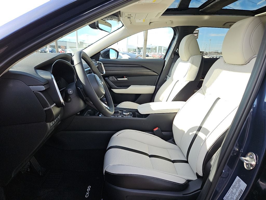 This 2026 Mazda CX-50 2.5 Turbo Premium Plus in ingot blue metallic comes with the following features: 2.5L I4 Turbocharged DOHC 16V LEV3-ULEV70 227hp 6-Speed Automatic AWD Accent Package, 12 Speakers, 4-Wheel Disc Brakes, ABS brakes, Air Conditioning, Alloy wheels, AM/FM radio: SiriusXM, AppLink/Apple CarPlay and Android Auto, Auto High-beam Headlights, Auto-dimming door mirrors, Auto-dimming Rear-View mirror, Automatic temperature control, Brake assist, Bumpers: body-color, Compass, Delay-off headlights, Driver door bin, Driver vanity mirror, Dual front impact airbags, Dual front side impact airbags, Electronic Stability Control, Emergency communication system: MAZDA CONNECT, Front and Rear Splash Guards, Front anti-roll bar, Front Bucket Seats, Front Center Armrest, Front dual zone A/C, Front reading lights, Front wheel independent suspension, Fully automatic headlights, Garage door transmitter: HomeLink, Heads-Up Display, Heated and Ventilated Front Seats with 3 Level Adjustment, Heated door mirrors, Heated front seats, Heated rear seats, Heated steering wheel, Illuminated entry, Ingot Blue Metallic and White Interior, Knee airbag, Leather Seat Trim, Leather Shift Knob, Leather steering wheel, Low tire pressure warning, Memory seat, Navigation system: MAZDA CONNECT, Occupant sensing airbag, Outside temperature display, Overhead airbag, Overhead console, Panic alarm, Passenger door bin, Passenger vanity mirror, Power door mirrors, Power driver seat, Power Liftgate, Power moonroof, Power passenger seat, Power steering, Power windows, Radio data system, Radio: AM/FM/HD Bose 12-Speaker Audio Sound System and Navigation, Rain sensing wipers, Rear seat center armrest, Rear window defroster, Rear window wiper, Remote keyless entry, Silver Cross Bars, Speed control, Speed-sensing steering, Split folding rear seat, Spoiler, Steering wheel mounted audio controls, Tachometer, Telescoping steering wheel, Tilt steering wheel, Traction control, Trip computer, Turn signal indicator mirrors, Variably intermittent wipers, Ventilated front seats, and Wheels: 20 x 8J Aluminum Alloy Black Metallic with Machining Cut. Price includes: $1500 - Customer Cash. Exp. 03/02/2026