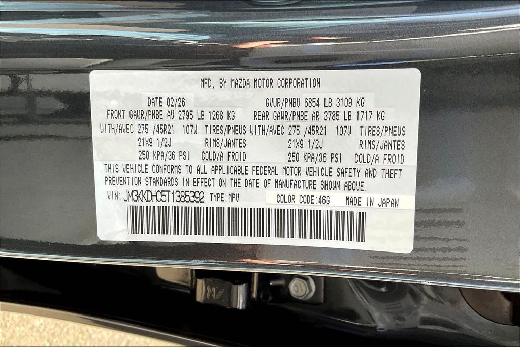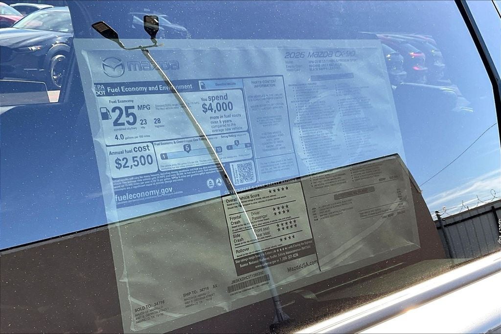 This 2026 Mazda CX-90 3.3 Turbo S Premium in Machine Gray Metallic comes with the following features: I6 8-Speed Automatic AWD 12 Speakers, 3rd row seats: bench, 4-Wheel Disc Brakes, ABS brakes, Air Conditioning, All Weather Floor Mats - Bench Seat, Alloy wheels, AM/FM radio: SiriusXM, Auto High-beam Headlights, Auto-dimming door mirrors, Auto-dimming Rear-View mirror, Automatic temperature control, Brake assist, Bumpers: body-color, Cargo Tray with Seatback Protection - Captain Chairs, Compass, Delay-off headlights, Driver door bin, Driver vanity mirror, Dual front impact airbags, Dual front side impact airbags, E911 Automatic Emergency Notification, Electronic Stability Control, Emergency communication system: MAZDA CONNECT, Four wheel independent suspension, Front anti-roll bar, Front Bucket Seats, Front Center Armrest w/Storage, Front dual zone A/C, Front reading lights, Fully automatic headlights, Garage door transmitter: HomeLink, Heads-Up Display, Heated door mirrors, Heated front seats, Heated rear seats, Heated steering wheel, Heated/Ventilated Front Bucket Seats, Illuminated entry, Infotainment System Voice Command, Knee airbag, Leather Shift Knob, Leather steering wheel, Low tire pressure warning, Machine Gray Metallic Paint Charge, Mazda Connected Services, Mazda Online Navigation, Memory seat, Nappa Leather Seat Trim, Navigation system: MAZDA CONNECT, Occupant sensing airbag, Outside temperature display, Overhead airbag, Overhead console, Panic alarm, Passenger door bin, Passenger vanity mirror, Power door mirrors, Power driver seat, Power Liftgate, Power moonroof, Power passenger seat, Power steering, Power windows, Radio Broadcast Data System Program Information, Radio data system, Radio: : AM/FM w/HD/Bose 12-Speaker Sound System, Rain sensing wipers, Rear air conditioning, Rear anti-roll bar, Rear reading lights, Rear seat center armrest, Rear window defroster, Rear window wiper, Remote keyless entry, Security system, SMS Text Msg Audio Delivery and Reply, Speed control, Speed-sensing steering, Split folding rear seat, Spoiler, Steering wheel memory, Steering wheel mounted audio controls, Tachometer, Telescoping steering wheel, Tilt steering wheel, Traction control, Trip computer, Turn signal indicator mirrors, Variably intermittent wipers, Ventilated front seats, and Wheels: 21 x 9.5J Aluminum Alloy with Black Metal Finish. Price includes: $1000 - Customer Cash. Exp. 04/30/2026 $2000 - Customer Cash. Exp. 04/30/2026