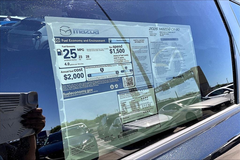 This 2026 Mazda CX-90 3.3 Turbo Select in Jet Black Mica comes with the following features: I6 Turbo 8-Speed Automatic AWD 3rd row seats: bench, 4-Wheel Disc Brakes, 8 Speakers, ABS brakes, Air Conditioning, All Weather Floor Mats - Bench Seat, Alloy wheels, AM/FM radio, AppLink/Apple CarPlay and Android Auto, Auto High-beam Headlights, Automatic temperature control, Brake assist, Bumpers: body-color, Compass, Cross Bars - Silver, Delay-off headlights, Driver door bin, Driver vanity mirror, Dual front impact airbags, Dual front side impact airbags, E911 Automatic Emergency Notification, Electronic Stability Control, Emergency communication system: MAZDA CONNECT, Exterior Parking Camera Rear, Four wheel independent suspension, Front anti-roll bar, Front Bucket Seats, Front Center Armrest w/Storage, Front dual zone A/C, Front reading lights, Fully automatic headlights, Heated door mirrors, Illuminated entry, Infotainment System Voice Command, Knee airbag, Leather Shift Knob, Leather steering wheel, Leatherette Seat Trim, Low tire pressure warning, Mazda Connected Services, Occupant sensing airbag, Outside temperature display, Overhead airbag, Overhead console, Panic alarm, Passenger door bin, Passenger vanity mirror, Power door mirrors, Power driver seat, Power Liftgate, Power steering, Power windows, Radio Broadcast Data System Program Information, Radio data system, Rain sensing wipers, Rear air conditioning, Rear anti-roll bar, Rear reading lights, Rear seat center armrest, Rear window defroster, Rear window wiper, Remote keyless entry, Speed control, Speed-sensing steering, Split folding rear seat, Spoiler, Steering wheel mounted audio controls, Tachometer, Telescoping steering wheel, Tilt steering wheel, Traction control, Trip computer, Turn signal indicator mirrors, and Variably intermittent wipers. Price includes: $2000 - Customer Cash. Exp. 04/30/2026 $500 - Customer Cash. Exp. 04/30/2026
