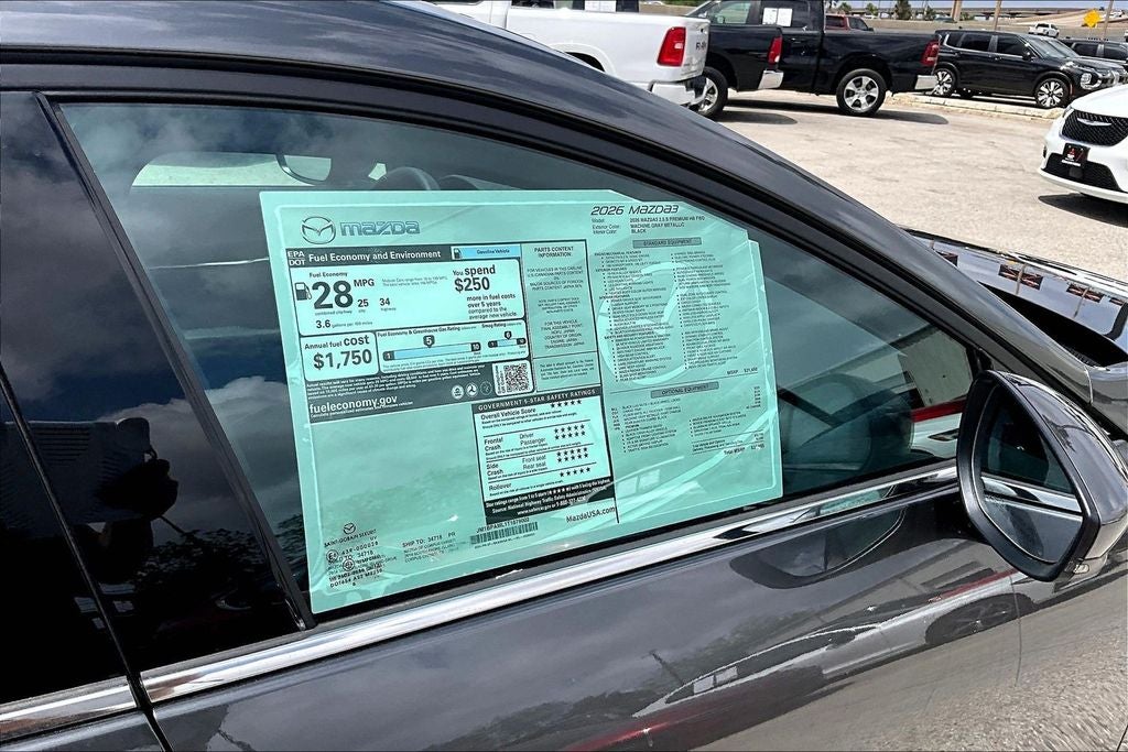 This 2026 Mazda Mazda3 2.5 S Premium in Machine Gray Metallic comes with the following features: SKYACTIV®-G 2.5L 4-Cylinder DOHC 16V 6-Speed Manual FWD 12 Speakers, 4-Wheel Disc Brakes, ABS brakes, Air Conditioning, Alloy wheels, AM/FM radio: SiriusXM, AppLink/Apple CarPlay and Android Auto, Auto High-beam Headlights, Automatic temperature control, Black Lug Nuts and Black Wheel Locks, Brake assist, Bumpers: body-color, Cargo Tray, Compass, Delay-off headlights, Driver door bin, Driver vanity mirror, Dual front impact airbags, Dual front side impact airbags, Electronic Stability Control, Emergency communication system, Exterior Parking Camera Rear, Front anti-roll bar, Front Bucket Seats, Front Center Armrest, Front dual zone A/C, Front reading lights, Front wheel independent suspension, Fully automatic headlights, Heads-Up Display, Heated door mirrors, Heated Front Bucket Seats, Heated front seats, High Wall All-Weather Floor Mats, Illuminated entry, Knee airbag, Leather Seat Trim, Leather Shift Knob, Leather steering wheel, Low tire pressure warning, Machine Gray Metallic Paint Charge, MAZDA CONNECT Infotainment System, Memory seat, Navigation system: Mazda Online Navigation, Occupant sensing airbag, Outside temperature display, Overhead airbag, Overhead console, Panic alarm, Passenger door bin, Passenger vanity mirror, Power door mirrors, Power driver seat, Power moonroof, Power steering, Power windows, Radio data system, Radio: AM/FM/HD Audio System, Rain sensing wipers, Rear seat center armrest, Rear side impact airbag, Rear window defroster, Rear window wiper, Remote keyless entry, Speed control, Speed-sensing steering, Split folding rear seat, Spoiler, Steering wheel mounted audio controls, Tachometer, Telescoping steering wheel, Tilt steering wheel, Traction control, Trip computer, Turn signal indicator mirrors, Variably intermittent wipers, and Wheels: 18 x 7J Aluminum Alloy. Price includes: $2000 - Customer Cash. Exp. 04/30/2026
