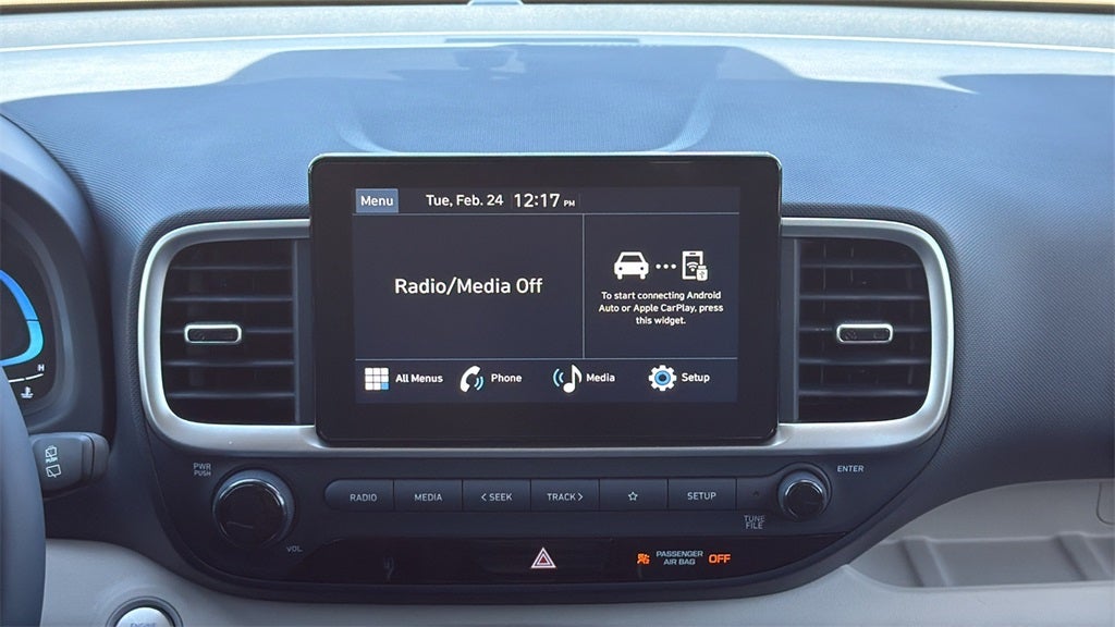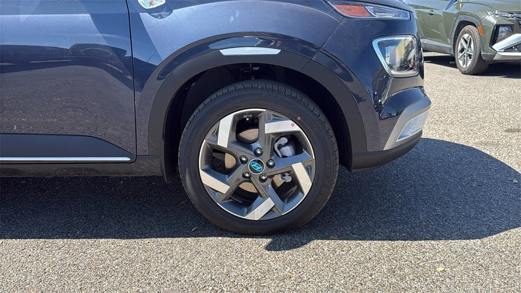 This 2026 Hyundai Venue SEL in Denim w/White Roof comes with the following features: I4 CVT FWD Option Group 01, 4-Wheel Disc Brakes, 6 Speakers, 6.5J x 17 Alloy Wheels, ABS brakes, Air Conditioning, Alloy wheels, AM/FM radio, Apple CarPlay & Android Auto, Auto High-beam Headlights, Automatic temperature control, Brake assist, Bumpers: body-color, Cargo Net, Carpeted Floor Mats, Cloth/H-Tex Combination Seat Trim, Delay-off headlights, Driver door bin, Driver vanity mirror, Dual front impact airbags, Dual front side impact airbags, Electronic Stability Control, First Aid Kit, Front anti-roll bar, Front Bucket Seats, Front Center Armrest, Front reading lights, Front wheel independent suspension, Fully automatic headlights, Heated door mirrors, Heated Front Bucket Seats, Heated front seats, Illuminated entry, Leather Shift Knob, Leather steering wheel, Low tire pressure warning, Occupant sensing airbag, Outside temperature display, Overhead airbag, Overhead console, Panic alarm, Passenger door bin, Passenger vanity mirror, Power door mirrors, Power steering, Power windows, Radio: AM/FM/HD Display Audio, Rear Seat Cup Holder, Rear window defroster, Rear window wiper, Remote keyless entry, Security system, Speed control, Speed-sensing steering, Split folding rear seat, Spoiler, Steering wheel mounted audio controls, Tachometer, Telescoping steering wheel, Tilt steering wheel, Traction control, Trip computer, and Variably intermittent wipers.