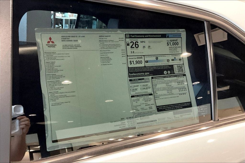 This 2026 Mitsubishi Eclipse Cross ES in White Diamond comes with the following features: 1.5L I4 DI Turbocharged DOHC 16V LEV3-ULEV125 152hp CVT 4WD Welcome Package (Carpet Floor Mats and Reversible Cargo Mat), 4 Speakers, 4-Wheel Disc Brakes, ABS brakes, Accessory Cargo Management System, Accessory Eclipse Cross All-Weather Floor Mat Set, Accessory Tonneau Cover, Air Conditioning, Alloy wheels, AM/FM radio, Android Auto & Apple CarPlay, Automatic temperature control, Brake assist, Bumpers: body-color, Cloth Fabric Seating Surfaces, Driver door bin, Driver vanity mirror, Dual front impact airbags, Dual front side impact airbags, Electronic Stability Control, Exterior Parking Camera Rear, Four wheel independent suspension, Front anti-roll bar, Front Bucket Seats, Front Center Armrest, Front fog lights, Front reading lights, Heated door mirrors, Illuminated entry, Knee airbag, Low tire pressure warning, Occupant sensing airbag, Outside temperature display, Overhead airbag, Overhead console, Panic alarm, Passenger door bin, Passenger vanity mirror, Power door mirrors, Power steering, Power windows, Radio data system, Radio: AM/FM 8.0 Smartphone-Link Display Audio, Rear anti-roll bar, Rear seat center armrest, Rear window defroster, Rear window wiper, Remote keyless entry, Security system, Speed control, Speed-sensing steering, Split folding rear seat, Spoiler, Steering wheel mounted audio controls, Tachometer, Telescoping steering wheel, Tilt steering wheel, Traction control, Trip computer, Turn signal indicator mirrors, Variably intermittent wipers, and Wheels: 16 x 6.5J Two-Tone Alloy.