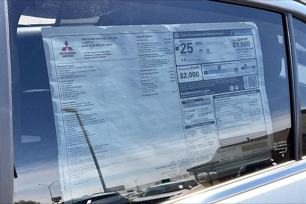 This 2026 Mitsubishi Eclipse Cross SEL in Alloy Silver Metallic comes with the following features: 1.5L I4 DI Turbocharged DOHC 16V LEV3-ULEV125 152hp CVT 4WD Welcome Package (Carpet Floor Mats and Reversible Cargo Mat), 4-Wheel Disc Brakes, 6 Speakers, ABS brakes, Accessory All Weather Cargo Tray, Accessory Cargo Management System, Accessory Eclipse Cross All-Weather Floor Mat Set, Accessory Roadside Assistance Kit, Accessory Tonneau Cover, Air Conditioning, Alloy wheels, AM/FM radio: SiriusXM, Android Auto & Apple CarPlay, Auto High-beam Headlights, Auto-dimming Rear-View mirror, Automatic temperature control, Blind Spot Warning, Brake assist, Bumpers: body-color, Delay-off headlights, Driver door bin, Driver vanity mirror, Dual front impact airbags, Dual front side impact airbags, Electronic Stability Control, Emergency communication system, Exterior Parking Camera Rear, Four wheel independent suspension, Front anti-roll bar, Front Bucket Seats, Front Center Armrest, Front dual zone A/C, Front fog lights, Front reading lights, Fully automatic headlights, Heated door mirrors, Heated Front Bucket Seats, Heated front seats, Illuminated entry, Knee airbag, Low tire pressure warning, Occupant sensing airbag, Outside temperature display, Overhead airbag, Overhead console, Panic alarm, Passenger door bin, Passenger vanity mirror, Power door mirrors, Power driver seat, Power Liftgate, Power steering, Power windows, Radio data system, Radio: AM/FM 8.0 Smartphone-Link Display Audio, Rain sensing wipers, Rear anti-roll bar, Rear seat center armrest, Rear window defroster, Rear window wiper, Remote keyless entry, Security system, Speed control, Speed-sensing steering, Split folding rear seat, Spoiler, Steering wheel mounted audio controls, Tachometer, Telescoping steering wheel, Tilt steering wheel, Traction control, Trip computer, Turn signal indicator mirrors, and Variably intermittent wipers.