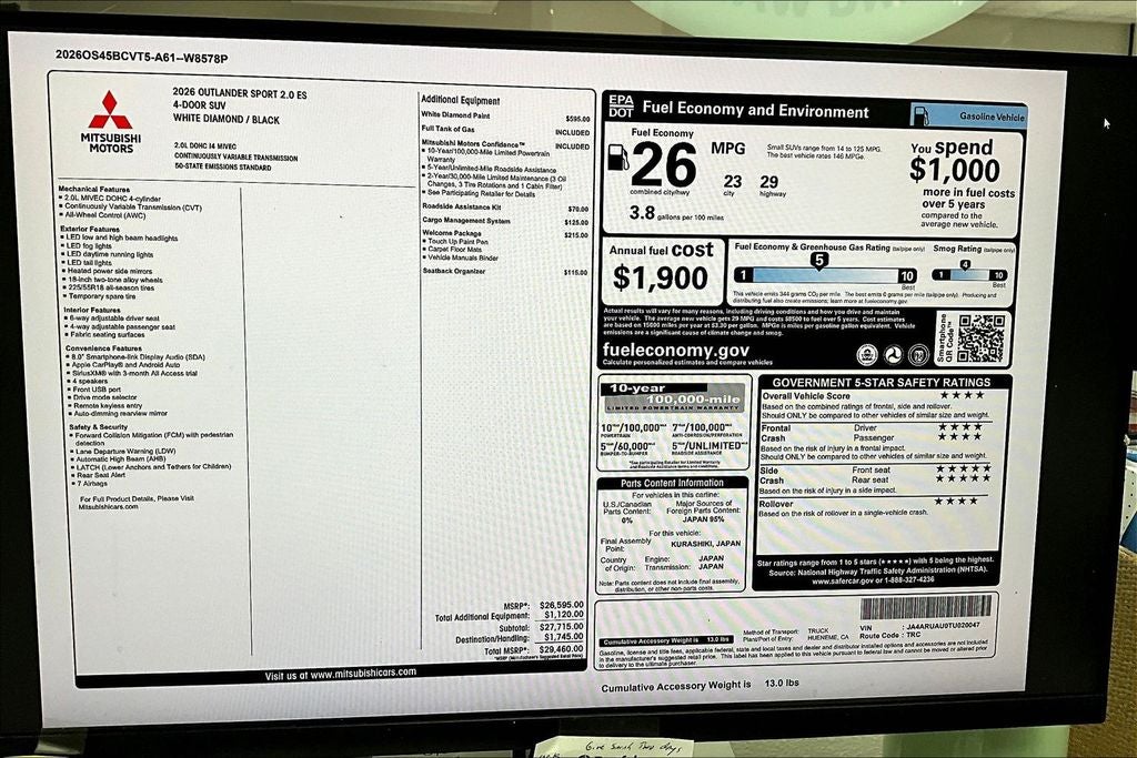 This 2026 Mitsubishi Outlander Sport 2.0 ES in White Diamond comes with the following features: 2.0L I4 SMPI DOHC 16V LEV3-ULEV70 148hp CVT 4WD Welcome Package (Floor Mat Set), 4WD, 4-Wheel Disc Brakes, ABS brakes, Accessory Roadside Assistance Kit, Air Conditioning, AM/FM radio: SiriusXM, Android Auto & Apple CarPlay, Auto High-beam Headlights, Auto-dimming Rear-View mirror, Automatic temperature control, Brake assist, Bumpers: body-color, Delay-off headlights, Driver door bin, Driver vanity mirror, Dual front impact airbags, Dual front side impact airbags, Electronic Stability Control, Exterior Parking Camera Rear, Four wheel independent suspension, Front anti-roll bar, Front Bucket Seats, Front Center Armrest, Front reading lights, Fully automatic headlights, Heated door mirrors, Illuminated entry, Knee airbag, Low tire pressure warning, Occupant sensing airbag, Outside temperature display, Overhead airbag, Panic alarm, Passenger door bin, Passenger vanity mirror, Power door mirrors, Power steering, Power windows, Radio data system, Radio: AM/FM 8.0 Smartphone Link Display Audio, Rain sensing wipers, Rear anti-roll bar, Rear seat center armrest, Rear window defroster, Rear window wiper, Remote keyless entry, Security system, Speed control, Speed-sensing steering, Split folding rear seat, Spoiler, Steering wheel mounted audio controls, Tachometer, Telescoping steering wheel, Tilt steering wheel, Traction control, Trip computer, and Variably intermittent wipers.