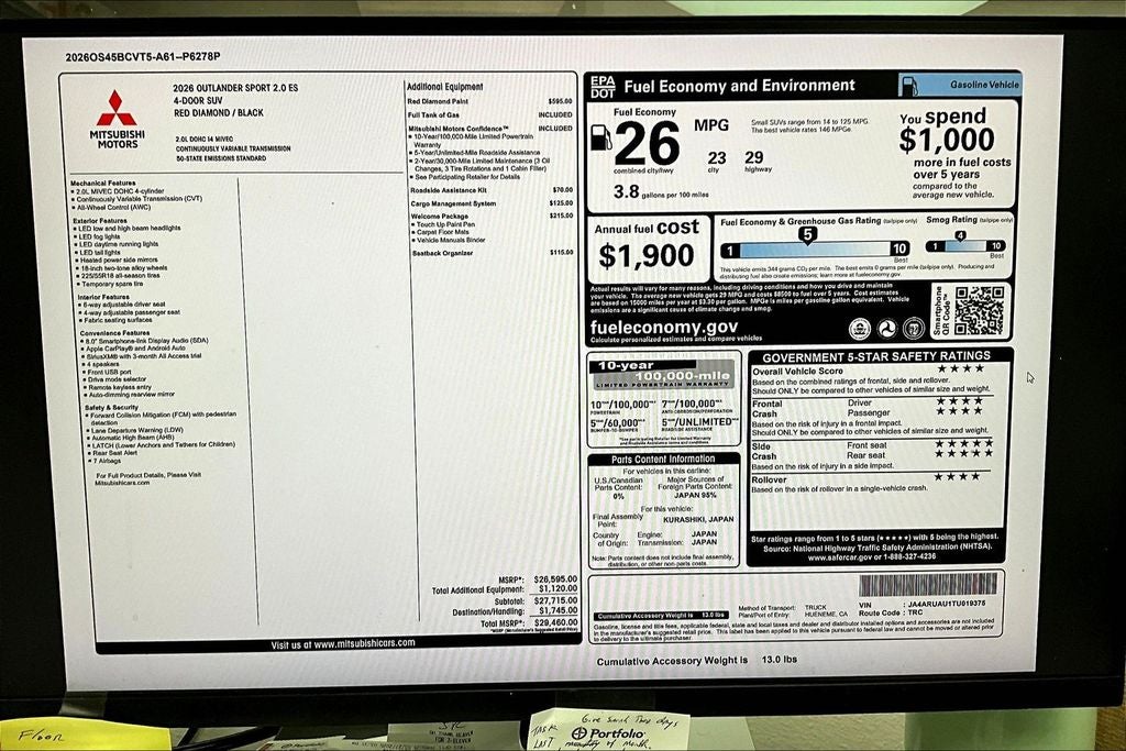 This 2026 Mitsubishi Outlander Sport 2.0 ES in Red Diamond comes with the following features: 2.0L I4 SMPI DOHC 16V LEV3-ULEV70 148hp CVT 4WD Welcome Package (Floor Mat Set), 4WD, 4-Wheel Disc Brakes, ABS brakes, Accessory Roadside Assistance Kit, Air Conditioning, AM/FM radio: SiriusXM, Android Auto & Apple CarPlay, Auto High-beam Headlights, Auto-dimming Rear-View mirror, Automatic temperature control, Brake assist, Bumpers: body-color, Delay-off headlights, Driver door bin, Driver vanity mirror, Dual front impact airbags, Dual front side impact airbags, Electronic Stability Control, Exterior Parking Camera Rear, Four wheel independent suspension, Front anti-roll bar, Front Bucket Seats, Front Center Armrest, Front reading lights, Fully automatic headlights, Heated door mirrors, Illuminated entry, Knee airbag, Low tire pressure warning, Occupant sensing airbag, Outside temperature display, Overhead airbag, Panic alarm, Passenger door bin, Passenger vanity mirror, Power door mirrors, Power steering, Power windows, Radio data system, Radio: AM/FM 8.0 Smartphone Link Display Audio, Rain sensing wipers, Rear anti-roll bar, Rear seat center armrest, Rear window defroster, Rear window wiper, Remote keyless entry, Security system, Speed control, Speed-sensing steering, Split folding rear seat, Spoiler, Steering wheel mounted audio controls, Tachometer, Telescoping steering wheel, Tilt steering wheel, Traction control, Trip computer, and Variably intermittent wipers.