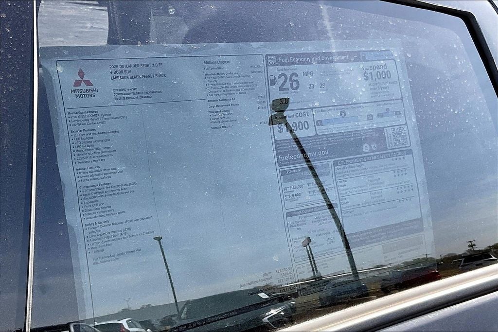 This 2026 Mitsubishi Outlander Sport 2.0 ES in Labrador Black Pearl comes with the following features: 2.0L I4 SMPI DOHC 16V LEV3-ULEV70 148hp CVT 4WD 4WD, 4-Wheel Disc Brakes, ABS brakes, Accessory Roadside Assistance Kit, Air Conditioning, AM/FM radio: SiriusXM, Android Auto & Apple CarPlay, Auto High-beam Headlights, Auto-dimming Rear-View mirror, Automatic temperature control, Brake assist, Bumpers: body-color, Delay-off headlights, Driver door bin, Driver vanity mirror, Dual front impact airbags, Dual front side impact airbags, Electronic Stability Control, Exterior Parking Camera Rear, Four wheel independent suspension, Front anti-roll bar, Front Bucket Seats, Front Center Armrest, Front reading lights, Fully automatic headlights, Heated door mirrors, Illuminated entry, Knee airbag, Low tire pressure warning, Occupant sensing airbag, Outside temperature display, Overhead airbag, Panic alarm, Passenger door bin, Passenger vanity mirror, Power door mirrors, Power steering, Power windows, Radio data system, Radio: AM/FM 8.0 Smartphone Link Display Audio, Rain sensing wipers, Rear anti-roll bar, Rear seat center armrest, Rear window defroster, Rear window wiper, Remote keyless entry, Security system, Speed control, Speed-sensing steering, Split folding rear seat, Spoiler, Steering wheel mounted audio controls, Tachometer, Telescoping steering wheel, Tilt steering wheel, Traction control, Trip computer, and Variably intermittent wipers.