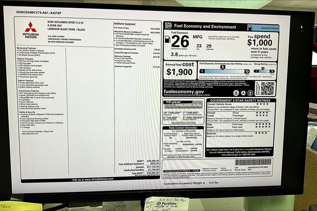 This 2026 Mitsubishi Outlander Sport 2.0 ES in Labrador Black Pearl comes with the following features: 2.0L I4 SMPI DOHC 16V LEV3-ULEV70 148hp CVT 4WD Welcome Package (Floor Mat Set), 4WD, 4-Wheel Disc Brakes, ABS brakes, Accessory Roadside Assistance Kit, Air Conditioning, AM/FM radio: SiriusXM, Android Auto & Apple CarPlay, Auto High-beam Headlights, Auto-dimming Rear-View mirror, Automatic temperature control, Brake assist, Bumpers: body-color, Delay-off headlights, Driver door bin, Driver vanity mirror, Dual front impact airbags, Dual front side impact airbags, Electronic Stability Control, Exterior Parking Camera Rear, Four wheel independent suspension, Front anti-roll bar, Front Bucket Seats, Front Center Armrest, Front reading lights, Fully automatic headlights, Heated door mirrors, Illuminated entry, Knee airbag, Low tire pressure warning, Occupant sensing airbag, Outside temperature display, Overhead airbag, Panic alarm, Passenger door bin, Passenger vanity mirror, Power door mirrors, Power steering, Power windows, Radio data system, Radio: AM/FM 8.0 Smartphone Link Display Audio, Rain sensing wipers, Rear anti-roll bar, Rear seat center armrest, Rear window defroster, Rear window wiper, Remote keyless entry, Security system, Speed control, Speed-sensing steering, Split folding rear seat, Spoiler, Steering wheel mounted audio controls, Tachometer, Telescoping steering wheel, Tilt steering wheel, Traction control, Trip computer, and Variably intermittent wipers.