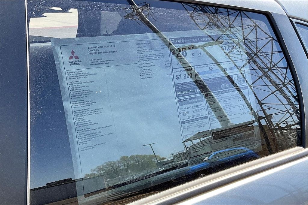 This 2026 Mitsubishi Outlander Sport 2.0 ES in Mercury Gray Metallic comes with the following features: 2.0L I4 SMPI DOHC 16V LEV3-ULEV70 148hp CVT 4WD 4WD, 4-Wheel Disc Brakes, ABS brakes, Accessory Roadside Assistance Kit, Air Conditioning, AM/FM radio: SiriusXM, Android Auto & Apple CarPlay, Auto High-beam Headlights, Auto-dimming Rear-View mirror, Automatic temperature control, Brake assist, Bumpers: body-color, Delay-off headlights, Driver door bin, Driver vanity mirror, Dual front impact airbags, Dual front side impact airbags, Electronic Stability Control, Exterior Parking Camera Rear, Four wheel independent suspension, Front anti-roll bar, Front Bucket Seats, Front Center Armrest, Front reading lights, Fully automatic headlights, Heated door mirrors, Illuminated entry, Knee airbag, Low tire pressure warning, Occupant sensing airbag, Outside temperature display, Overhead airbag, Panic alarm, Passenger door bin, Passenger vanity mirror, Power door mirrors, Power steering, Power windows, Radio data system, Radio: AM/FM 8.0 Smartphone Link Display Audio, Rain sensing wipers, Rear anti-roll bar, Rear seat center armrest, Rear window defroster, Rear window wiper, Remote keyless entry, Security system, Speed control, Speed-sensing steering, Split folding rear seat, Spoiler, Steering wheel mounted audio controls, Tachometer, Telescoping steering wheel, Tilt steering wheel, Traction control, Trip computer, and Variably intermittent wipers.