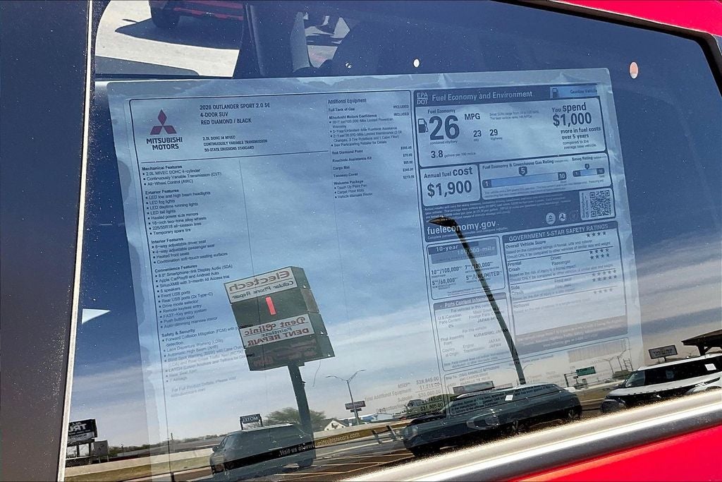 This 2026 Mitsubishi Outlander Sport 2.0 SE in Red Diamond comes with the following features: 2.0L I4 SMPI DOHC 16V LEV3-ULEV70 148hp CVT 4WD Welcome Package (Floor Mat Set), 4WD, 4-Wheel Disc Brakes, ABS brakes, Accessory Roadside Assistance Kit, Accessory Tonneau Cover, Air Conditioning, AM/FM radio: SiriusXM, Android Auto & Apple CarPlay, Auto High-beam Headlights, Auto-dimming Rear-View mirror, Automatic temperature control, Brake assist, Bumpers: body-color, Delay-off headlights, Driver door bin, Driver vanity mirror, Dual front impact airbags, Dual front side impact airbags, Electronic Stability Control, Exterior Parking Camera Rear, Four wheel independent suspension, Front anti-roll bar, Front Bucket Seats, Front Center Armrest, Front reading lights, Fully automatic headlights, Heated door mirrors, Illuminated entry, Knee airbag, Low tire pressure warning, Occupant sensing airbag, Outside temperature display, Overhead airbag, Panic alarm, Passenger door bin, Passenger vanity mirror, Power door mirrors, Power steering, Power windows, Radio data system, Radio: AM/FM 8.0 Smartphone Link Display Audio, Rain sensing wipers, Rear anti-roll bar, Rear seat center armrest, Rear window defroster, Rear window wiper, Remote keyless entry, Security system, Speed control, Speed-sensing steering, Split folding rear seat, Spoiler, Steering wheel mounted audio controls, Tachometer, Telescoping steering wheel, Tilt steering wheel, Traction control, Trip computer, and Variably intermittent wipers.