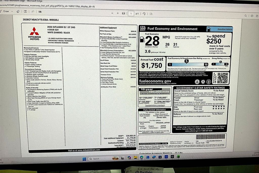 This 2026 Mitsubishi Outlander ES in White Diamond comes with the following features: 1.5L I4 Turbocharged DOHC 16V LEV3-SULEV30 174hp CVT FWD Welcome Package, 18 Alloy Wheels, 3rd row seats: split-bench, 4-Wheel Disc Brakes, 8 Speakers, ABS brakes, Accessory All-Weather Floor Mats, Accessory Grille Paint Protection Film, Accessory Hood Paint Protection Film, Accessory Metal Cargo Scuff Plates, Accessory Scuff Plates, Accessory Seat Back Net, Accessory Tonneau Cover, Air Conditioning, Alloy wheels, AM/FM radio: SiriusXM, Android Auto & Apple CarPlay, Auto High-beam Headlights, Auto-dimming Rear-View mirror, Automatic temperature control, Blind Spot Warning, Brake assist, Bumpers: body-color, Cloth Fabric Seating Surfaces, Compass, Delay-off headlights, Driver door bin, Driver vanity mirror, Dual front impact airbags, Dual front side impact airbags, Electronic Stability Control, Emergency communication system: Mitsubishi Connect w/ 24-month trial, Exterior Parking Camera Rear, Four wheel independent suspension, Front anti-roll bar, Front Bucket Seats, Front Center Armrest w/Storage, Front dual zone A/C, Front reading lights, Fully automatic headlights, Illuminated entry, Knee airbag, Low tire pressure warning, Navigation System, Occupant sensing airbag, Outside temperature display, Overhead airbag, Overhead console, Panic alarm, Passenger door bin, Passenger vanity mirror, Power door mirrors, Power steering, Power windows, Radio data system, Radio: AM/FM 12.3 Navigation with Smartphone-Link, Rear anti-roll bar, Rear Parking Sensors, Rear seat center armrest, Rear side impact airbag, Rear window defroster, Rear window wiper, Reclining 3rd row seat, Remote keyless entry, Security system, Speed control, Speed-Sensitive Wipers, Split folding rear seat, Spoiler, Steering wheel mounted audio controls, Tachometer, Telescoping steering wheel, Tilt steering wheel, Traction control, Trip computer, Turn signal indicator mirrors, and Variably intermittent wipers. Price includes: $1000 - Customer Cash. Exp. 04/30/2026