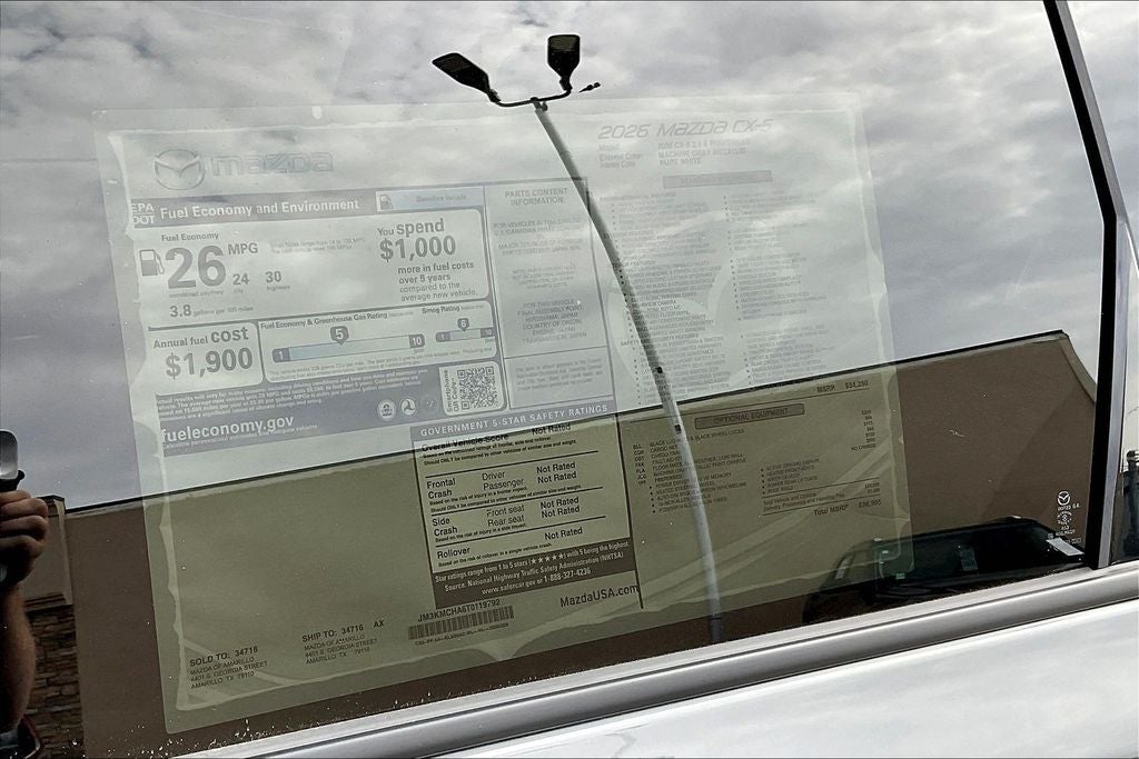 This 2026 Mazda CX-5 2.5 S Preferred in Machine Gray Metallic comes with the following features: SKYACTIV®-G 2.5L 4-Cylinder DOHC 16V 6-Speed Automatic AWD 4-Wheel Disc Brakes, 8 Speakers, ABS brakes, Air Conditioning, Alloy wheels, AM/FM radio, AppLink/Apple CarPlay and Android Auto, Auto High-beam Headlights, Auto-dimming Rear-View mirror, Automatic temperature control, Black Lug Nuts and Black Wheel Locks, Brake assist, Bumpers: body-color, Cargo Net, Cargo Tray, Compass, Delay-off headlights, Driver door bin, Driver vanity mirror, Dual front impact airbags, Dual front side impact airbags, Electronic Stability Control, Emergency communication system: 911 Emergency Notification, Exterior Parking Camera Rear, Four wheel independent suspension, Front anti-roll bar, Front Bucket Seats, Front Center Armrest w/Storage, Front dual zone A/C, Front reading lights, Fully automatic headlights, Garage door transmitter: HomeLink, Heads-Up Display, Heated door mirrors, Heated Front Bucket Seats, Heated front seats, Heated steering wheel, Illuminated entry, Knee airbag, Leather Shift Knob, Leather steering wheel, Leatherette Seat Trim with Microsuede Insert, Low tire pressure warning, Machine Gray Metallic Paint Charge, Memory seat, Navigation system: Google built-in, Occupant sensing airbag, Outside temperature display, Overhead airbag, Overhead console, Panic alarm, Passenger door bin, Passenger vanity mirror, Power door mirrors, Power driver seat, Power Liftgate, Power steering, Power windows, Radio data system, Radio: AM/FM/HD Audio System, Rain sensing wipers, Rear anti-roll bar, Rear reading lights, Rear seat center armrest, Rear window defroster, Rear window wiper, Remote keyless entry, Speed control, Speed-sensing steering, Split folding rear seat, Spoiler, Steering wheel mounted audio controls, Tachometer, Telescoping steering wheel, Tilt steering wheel, Traction control, Trip computer, Turn signal indicator mirrors, Variably intermittent wipers, and Wheels: 19 x 7J Aluminum Alloy.