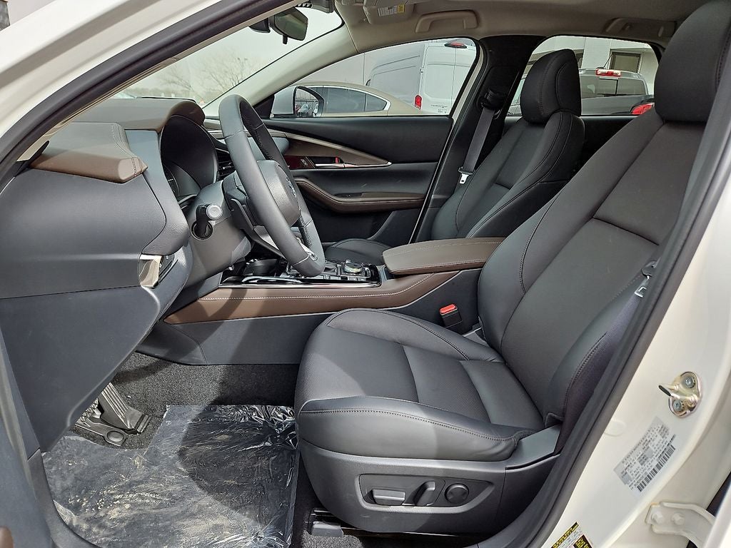 This 2025 Mazda CX-30 2.5 S Premium Package in Snowflake White Pearl Mica comes with the following features: SKYACTIV® 2.5L 4-Cylinder DOHC 16V 6-Speed Automatic AWD 12 Speakers, 4-Wheel Disc Brakes, ABS brakes, Air Conditioning, Alloy wheels, AM/FM radio: SiriusXM, AppLink/Apple CarPlay and Android Auto, Auto High-beam Headlights, Automatic temperature control, Brake assist, Bumpers: body-color, Cargo Cover, Compass, Delay-off headlights, Driver door bin, Driver vanity mirror, Dual front impact airbags, Dual front side impact airbags, Electronic Stability Control, Emergency communication system: Mazda Connected Services (3-year trial subscription included), Exterior Parking Camera Rear, Front anti-roll bar, Front Bucket Seats, Front Center Armrest, Front dual zone A/C, Front reading lights, Front wheel independent suspension, Fully automatic headlights, Heads-Up Display, Heated door mirrors, Heated Front Bucket Seats, Heated front seats, Illuminated entry, Knee airbag, Leather Seat Trim, Leather Shift Knob, Leather steering wheel, Low tire pressure warning, MAZDA CONNECT Infotainment System, Memory seat, Navigation system: MAZDA CONNECT, Occupant sensing airbag, Outside temperature display, Overhead airbag, Overhead console, Panic alarm, Passenger door bin, Passenger vanity mirror, Power door mirrors, Power driver seat, Power Liftgate, Power moonroof, Power steering, Power windows, Radio data system, Radio: AM/FM/HD Audio w/Mazda Online Navigation, Rain sensing wipers, Rear seat center armrest, Rear side impact airbag, Rear window defroster, Rear window wiper, Remote keyless entry, Snowflake White Pearl Mica Paint Charge, Speed control, Speed-sensing steering, Split folding rear seat, Spoiler, Stainless Steel Rear Bumper Guard, Steering wheel mounted audio controls, Tachometer, Telescoping steering wheel, Tilt steering wheel, Traction control, Trip computer, Turn signal indicator mirrors, Variably intermittent wipers, Wheel Locks, and Wheels: 18 x 7J Aluminum Alloy.