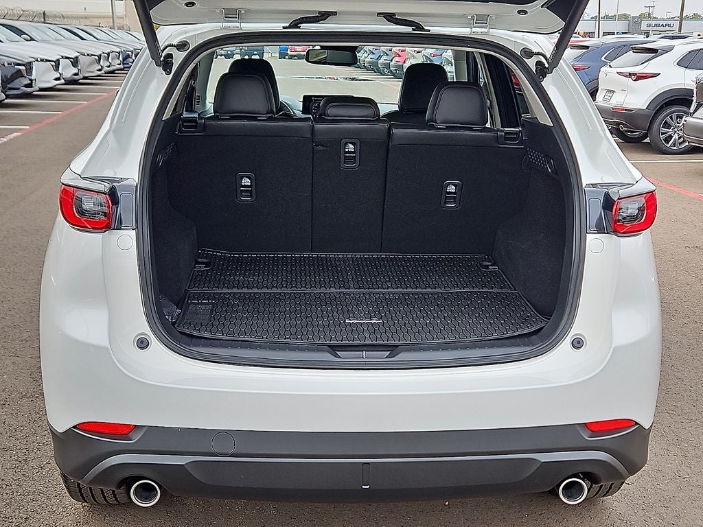 This 2025 Mazda CX-5 2.5 S Carbon Edition in Rhodium White Metallic comes with the following features: SKYACTIV® 2.5L 4-Cylinder DOHC 16V 6-Speed Automatic AWD 10 Speakers, 4-Wheel Disc Brakes, ABS brakes, Air Conditioning, Alloy wheels, AM/FM radio, AppLink/Apple CarPlay and Android Auto, Auto High-beam Headlights, Auto-dimming Rear-View mirror, Automatic temperature control, Black Lug Nuts & Black Wheel Locks, Brake assist, Bumpers: body-color, Cargo Tray, Delay-off headlights, Driver door bin, Driver vanity mirror, Dual front impact airbags, Dual front side impact airbags, E911 Automatic Emergency Notification, Electronic Stability Control, Emergency communication system: MAZDA CONNECT, Exterior Parking Camera Rear, First Aid Kit, Four wheel independent suspension, Front anti-roll bar, Front Bucket Seats, Front Center Armrest w/Storage, Front dual zone A/C, Front reading lights, Fully automatic headlights, Garage door transmitter: HomeLink, Heated Front Bucket Seats, Heated front seats, Illuminated entry, Infotainment System Voice Command, Leather Seat Trim, Leather Shift Knob, Leather steering wheel, Low tire pressure warning, Memory seat, Multifunction Commander Control, Occupant sensing airbag, Outside temperature display, Overhead airbag, Overhead console, Pandora, Panic alarm, Passenger door bin, Passenger vanity mirror, Power door mirrors, Power driver seat, Power Liftgate, Power moonroof, Power passenger seat, Power steering, Power windows, Radio Broadcast Data System Program Information, Radio data system, Radio: AM/FM/HD Audio System, Rain sensing wipers, Rear anti-roll bar, Rear reading lights, Rear seat center armrest, Rear window defroster, Rear window wiper, Remote keyless entry, SMS Text Msg Audio Delivery & Reply, Speed control, Speed-sensing steering, Split folding rear seat, Spoiler, Steering wheel mounted audio controls, Tachometer, Telescoping steering wheel, Tilt steering wheel, Traction control, Trip computer, Turn signal indicator mirrors, Variably intermittent wipers, and Wheels: 19 x 7J Aluminum Alloy.