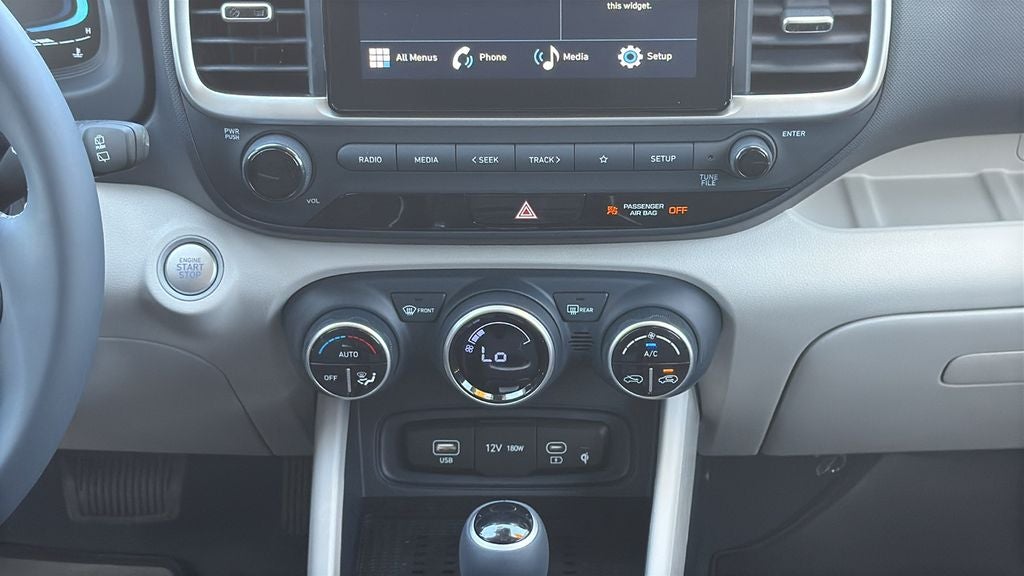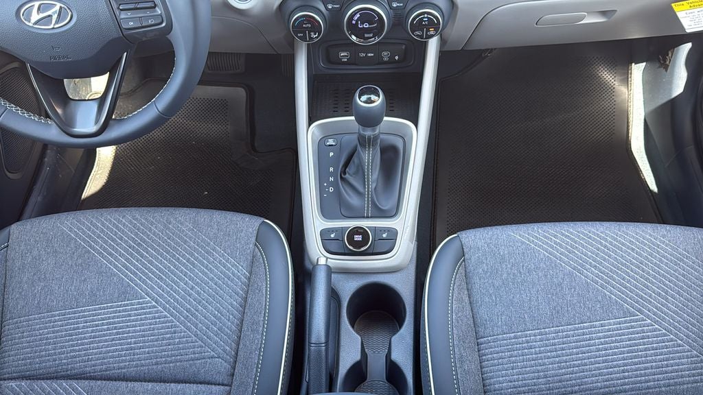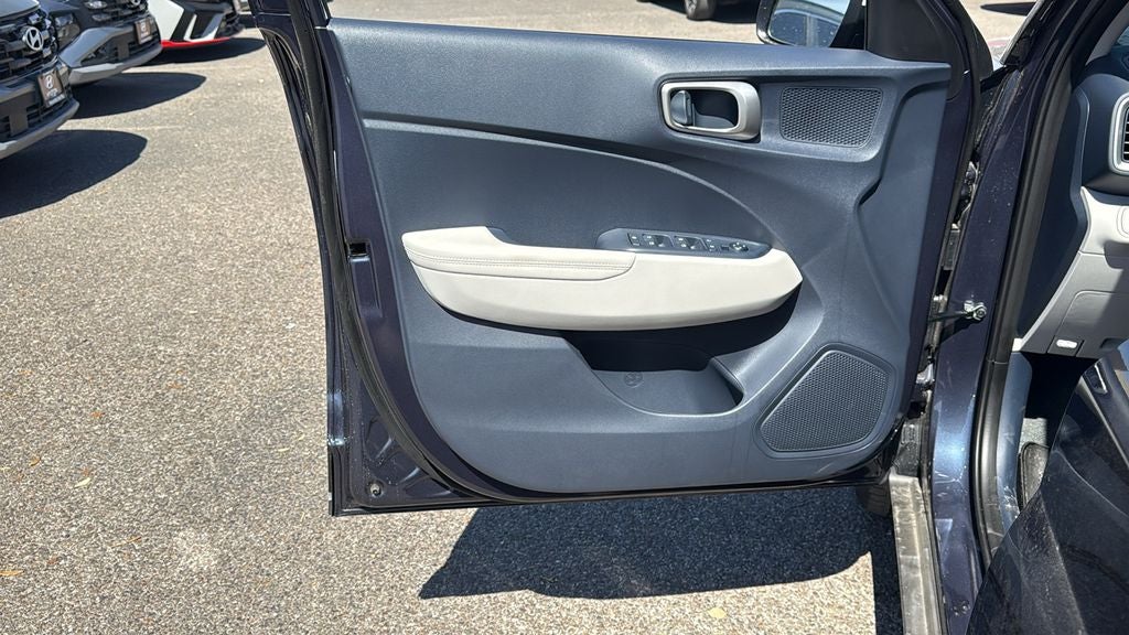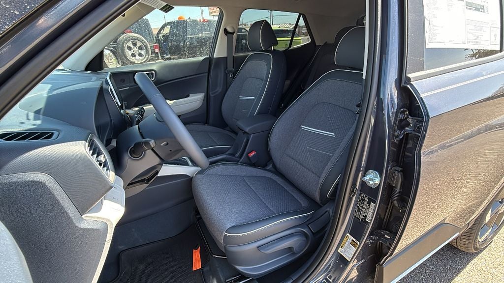 This 2026 Hyundai Venue SEL in Denim w/White Roof comes with the following features: I4 CVT FWD Option Group 01, 4-Wheel Disc Brakes, 6 Speakers, 6.5J x 17 Alloy Wheels, ABS brakes, Air Conditioning, Alloy wheels, AM/FM radio, Apple CarPlay & Android Auto, Auto High-beam Headlights, Automatic temperature control, Brake assist, Bumpers: body-color, Cargo Net, Cargo Tray, Carpeted Floor Mats, Cloth/H-Tex Combination Seat Trim, Delay-off headlights, Driver door bin, Driver vanity mirror, Dual front impact airbags, Dual front side impact airbags, Electronic Stability Control, First Aid Kit, Front anti-roll bar, Front Bucket Seats, Front Center Armrest, Front reading lights, Front wheel independent suspension, Fully automatic headlights, Heated door mirrors, Heated Front Bucket Seats, Heated front seats, Illuminated entry, Leather Shift Knob, Leather steering wheel, Low tire pressure warning, Mud Guards, Occupant sensing airbag, Outside temperature display, Overhead airbag, Overhead console, Panic alarm, Passenger door bin, Passenger vanity mirror, Power door mirrors, Power steering, Power windows, Radio: AM/FM/HD Display Audio, Rear Seat Cup Holder, Rear window defroster, Rear window wiper, Remote keyless entry, Security system, Speed control, Speed-sensing steering, Split folding rear seat, Spoiler, Steering wheel mounted audio controls, Tachometer, Telescoping steering wheel, Tilt steering wheel, Traction control, Trip computer, and Variably intermittent wipers.