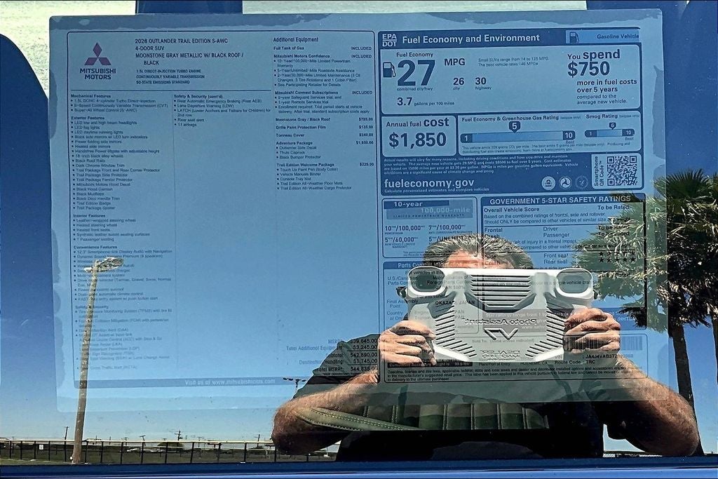 This 2026 Mitsubishi Outlander Trail Edition in Moonstone Gray/Black Roof comes with the following features: 1.5L I4 Turbocharged DOHC 16V LEV3-SULEV30 174hp CVT AWD AWD, 3rd row seats: split-bench, 4-Wheel Disc Brakes, 8 Speakers, ABS brakes, Accessory Grille Paint Protection Film, Accessory Tonneau Cover, Air Conditioning, Alloy wheels, AM/FM radio: SiriusXM, Android Auto & Apple CarPlay, Auto High-beam Headlights, Auto-dimming Rear-View mirror, Automatic temperature control, Brake assist, Bumpers: body-color, Compass, Delay-off headlights, Driver door bin, Driver vanity mirror, Dual front impact airbags, Dual front side impact airbags, Electronic Stability Control, Emergency communication system: Mitsubishi Connect w/ 24-month trial, Exterior Parking Camera Rear, Four wheel independent suspension, Front anti-roll bar, Front Bucket Seats, Front Center Armrest w/Storage, Front dual zone A/C, Front fog lights, Front reading lights, Fully automatic headlights, Headlight cleaning, Heated door mirrors, Heated Front Bucket Seats, Heated front seats, Illuminated entry, Knee airbag, Leather Shift Knob, Leather steering wheel, Low tire pressure warning, Navigation System, Occupant sensing airbag, Outside temperature display, Overhead airbag, Overhead console, Panic alarm, Passenger door bin, Passenger vanity mirror, Power door mirrors, Power driver seat, Power Liftgate, Power steering, Power windows, Radio data system, Radio: AM/FM 12.3 Navigation with Smartphone-Link, Rain sensing wipers, Rear anti-roll bar, Rear seat center armrest, Rear side impact airbag, Rear window defroster, Rear window wiper, Reclining 3rd row seat, Remote keyless entry, Security system, Speed control, Speed-Sensitive Wipers, Split folding rear seat, Spoiler, Steering wheel mounted audio controls, Synthetic Leather Seating Surfaces, Tachometer, Telescoping steering wheel, Tilt steering wheel, Traction control, Trip computer, Turn signal indicator mirrors, and Variably intermittent wipers. Price includes: $2500 - Customer Cash. Exp. 03/31/2026