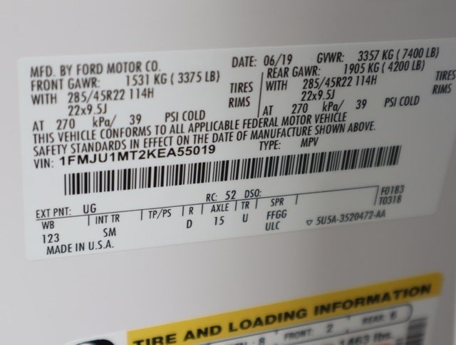 This 2019 Ford Expedition Platinum in White Platinum comes with the following features: EcoBoost 3.5L V6 GTDi DOHC 24V Twin Turbocharged 10-Speed Automatic 4WD Equipment Group 600A, 4WD, Adaptive suspension, Front Bucket Seats, Heated & Cooled Perforated Leather Fr Bucket Seats, Heated front seats, Heated rear seats, Heated steering wheel, Power Liftgate, Power moonroof, Power passenger seat, Radio: B&O Sound System by Bang & Olufsen, Rear air conditioning, SiriusXM Satellite Radio, Speed-sensing steering, SYNC 3 Communications & Entertainment System, Ventilated front seats, 12 Speakers, 22 Polished Aluminum Wheels, 3.31 Axle Ratio, 3rd row seats: split-bench, 4-Wheel Disc Brakes, ABS brakes, Adjustable pedals, Air Conditioning, Alloy wheels, AM/FM radio: SiriusXM, AppLink/Apple CarPlay and Android Auto, Auto High-beam Headlights, Auto-dimming door mirrors, Auto-dimming Rear-View mirror, Automatic temperature control, Brake assist, Bumpers: body-color, Compass, Delay-off headlights, Driver door bin, Driver vanity mirror, Dual front impact airbags, Dual front side impact airbags, Electronic Stability Control, Emergency communication system: SYNC 3 911 Assist, Exterior Parking Camera Rear, Four wheel independent suspension, Front anti-roll bar, Front Center Armrest, Front dual zone A/C, Front fog lights, Front reading lights, Fully automatic headlights, Garage door transmitter, Genuine wood console insert, Genuine wood dashboard insert, Genuine wood door panel insert, Heated door mirrors, Illuminated entry, Lane Departure Warning System, Leather steering wheel, Low tire pressure warning, Memory seat, Navigation System, Occupant sensing airbag, Outside temperature display, Overhead airbag, Overhead console, Panic alarm, Passenger door bin, Passenger vanity mirror, Pedal memory, Power door mirrors, Power driver seat, Power steering, Power windows, Radio data system, Rain sensing wipers, Rear anti-roll bar, Rear audio controls, Rear reading lights, Rear window defroster, Rear window wiper, Remote keyless entry, Reversible Cargo Mat, Roof rack, Security system, Speed control, Speed-Sensitive Wipers, Split folding rear seat, Steering wheel mounted audio controls, Tachometer, Telescoping steering wheel, Tilt steering wheel, Traction control, Trip computer, Turn signal indicator mirrors, Variably intermittent wipers, and Voltmeter.