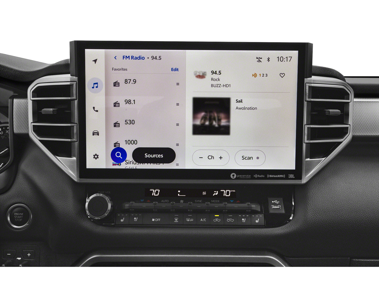 - Radio: AM/FM -inc: 14" touchscreen audio multimedia, Android Auto and Apple CarPlay compatible and SiriusXM w/3-month platinum plan trial subscription, See toyota.com/audio-multimedia for details, Connected services - Safety Connect w/1-year trial, remote connect w/1-year trial, drive connect w/1-year trial, service connect w/3-year trial, Wi-Fi connect w/up to 3 GB within 1-month trial, See toyota.com/connected-services for details