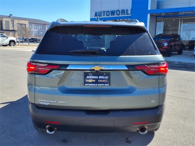 This 2023 Chevrolet Traverse LT in Silver Sage Metallic comes with the following features: 3.6L V6 SIDI VVT 9-Speed Automatic AWD Front License Plate Bracket Mounting Package, Preferred Equipment Group 1LT (Heated Driver & Front Passenger Seats), 2-Way Manual Front Passenger Seat Adjuster, 3.49 Axle Ratio, 3rd row seats: split-bench, 4-Wheel Disc Brakes, 6 Speakers, 6-Speaker Audio System Feature, 8-Passenger Seating (2-3-3 Seating Configuration), 8-Way Power Driver Seat Adjuster, ABS brakes, Air Conditioning, Alloy wheels, AM/FM radio: SiriusXM, Apple CarPlay/Android Auto, Auto High-beam Headlights, Automatic temperature control, Black Roof Rails, Brake assist, Bumpers: body-color, Compass, Delay-off headlights, Driver door bin, Driver vanity mirror, Dual front impact airbags, Dual front side impact airbags, Electronic Stability Control, Emergency communication system, Exterior Parking Camera Rear, Four wheel independent suspension, Front anti-roll bar, Front Bucket Seats, Front Center Armrest, Front dual zone A/C, Front reading lights, Fully automatic headlights, Garage door transmitter, Heated door mirrors, Heated front seats, Illuminated entry, Leather steering wheel, Low tire pressure warning, Occupant sensing airbag, Outside temperature display, Overhead airbag, Overhead console, Panic alarm, Passenger door bin, Passenger vanity mirror, Power door mirrors, Power Driver Lumbar Control, Power driver seat, Power Liftgate, Power steering, Power windows, Premium Cloth Seat Trim, Radio data system, Radio: Chevrolet Infotainment 3 Plus System, Rear air conditioning, Rear anti-roll bar, Rear reading lights, Rear window defroster, Rear window wiper, Remote keyless entry, Security system, SiriusXM w/360L, Speed control, Speed-sensing steering, Spoiler, Steering wheel mounted audio controls, Tachometer, Telescoping steering wheel, Tilt steering wheel, Traction control, Trip computer, Turn signal indicator mirrors, Variably intermittent wipers, Voltmeter, and Wheels: 18 Bright Silver-Painted Aluminum.