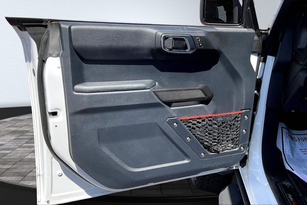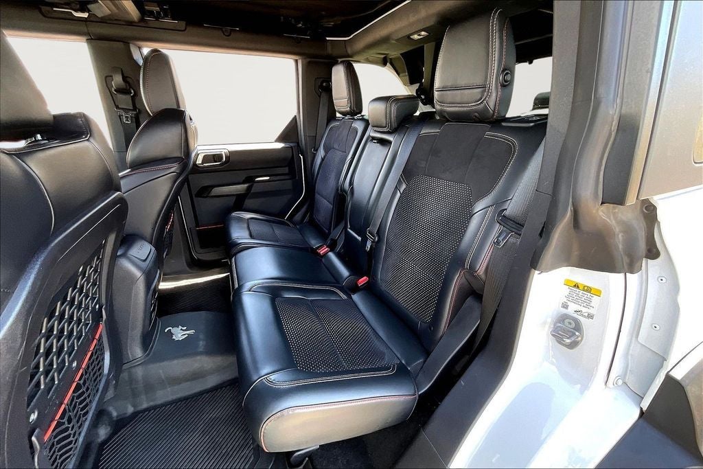 This 2023 Ford Bronco Raptor in Oxford White comes with the following features: 3.0L EcoBoost V6 10-Speed Automatic 4WD Equipment Group 374A Lux Package, Lux Package (10 Speakers w/Subwoofer, 2 Smart Charging USB Ports In Dashboard, Adaptive Cruise Control, Connected Built-In Navigation, Evasive Steering Assist, Heated Steering Wheel, Radio: B&O Sound System by Bang & Olufsen, Universal Garage Door Opener, and Wireless Charging Pad), 4-Wheel Disc Brakes, 4.7 Axle Ratio, 7 Speakers, ABS brakes, Air Conditioning, Alloy wheels, AM/FM radio: SiriusXM with 360L, AM/FM Stereo, Auto High-beam Headlights, Auto-dimming Rear-View mirror, Automatic temperature control, Brake assist, Compass, Connected Navigation, Convertible HardTop, Convertible roof lining, Delay-off headlights, Driver door bin, Driver vanity mirror, Dual front impact airbags, Dual front side impact airbags, Electronic Stability Control, Emergency communication system: 911 Assist, Exterior Parking Camera Rear, Front anti-roll bar, Front Bucket Seats, Front Center Armrest, Front dual zone A/C, Front fog lights, Front reading lights, Front wheel independent suspension, Fully automatic headlights, Glass rear window, Hard Top Sound Deadening Headliner (DISC), Heated door mirrors, Heated front seats, Illuminated entry, Integrated roll-over protection, Leather Shift Knob, Low tire pressure warning, Marine Grade Vinyl Bucket Seats, Navigation system: Connected Navigation, Occupant sensing airbag, Outside temperature display, Overhead airbag, Overhead console, Panic alarm, Passenger door bin, Passenger vanity mirror, Power door mirrors, Power steering, Power windows, Radio data system, Rear anti-roll bar, Rear seat center armrest, Rear window defroster, Rear window wiper, Remote keyless entry, Security system, SiriusXM Radio w/360L, Speed control, Split folding rear seat, Steering wheel mounted audio controls, SYNC 4, Tachometer, Telescoping steering wheel, Tilt steering wheel, Traction control, Trip computer, Turn signal indicator mirrors, Variably intermittent wipers, Voltmeter, Wheels: 17 Black High Gloss-Painted Aluminum, and Wheels: 17 Dark Carbonized Gray Alloy Painted.
