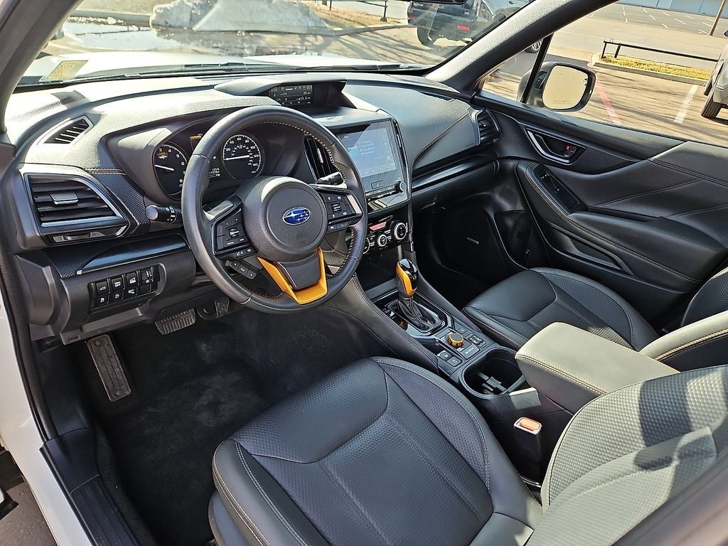 This 2024 Subaru Forester Wilderness in Crystal White Pearl comes with the following features: 2.5L 4-Cylinder DOHC 16V Lineartronic CVT AWD 8 Audio w/harman/kardon & Power Rear Gate (harman/kardon 9-Speaker Audio System, Power Rear Gate, and Radio: Subaru STARLINK 8.0 Multimedia Nav System), Convenience Package (Auto-Dimming Exterior Mirror w/Approach Light, Auto-Dimming Mirror w/Compass & HomeLink, LED Upgrade, and Rear Bumper Cover), 4-Wheel Disc Brakes, 4.11 Axle Ratio, 6 Speakers, ABS brakes, Air Conditioning, Alloy wheels, AM/FM radio: SiriusXM, Anti-whiplash front head restraints, Auto High-beam Headlights, Automatic temperature control, Brake assist, Bumpers: body-color, Driver door bin, Driver vanity mirror, Dual front impact airbags, Dual front side impact airbags, Electronic Stability Control, Emergency communication system: STARLINK Safety and Security (Subscription Required), Exterior Parking Camera Rear, Four wheel independent suspension, Front anti-roll bar, Front Bucket Seats, Front Center Armrest, Front dual zone A/C, Front fog lights, Front reading lights, Fully automatic headlights, Heated door mirrors, Heated Front Bucket Seats, Heated front seats, Illuminated entry, Knee airbag, Leather Shift Knob, Leather steering wheel, Low tire pressure warning, Navigation System, Occupant sensing airbag, Outside temperature display, Overhead airbag, Overhead console, Panic alarm, Passenger door bin, Passenger vanity mirror, Power door mirrors, Power driver seat, Power moonroof: Panoramic, Power steering, Power windows, Radio data system, Radio: Subaru STARLINK 8.0 Multimedia Plus System, Rear anti-roll bar, Rear seat center armrest, Rear window defroster, Rear window wiper, Remote keyless entry, Roof rack: rails only, Security system, Speed control, Speed-sensing steering, Split folding rear seat, Spoiler, STARLINK/Apple CarPlay/Android Auto, Steering wheel mounted audio controls, Sunshade - Windshield, Tachometer, Telescoping steering wheel, Textured StarTex Upholstery, Tilt steering wheel, Traction control, Trip computer, Turn signal indicator mirrors, Variably intermittent wipers, and Wheels: 17 x 7.0 J Matte Black Finish Alum-Alloy.