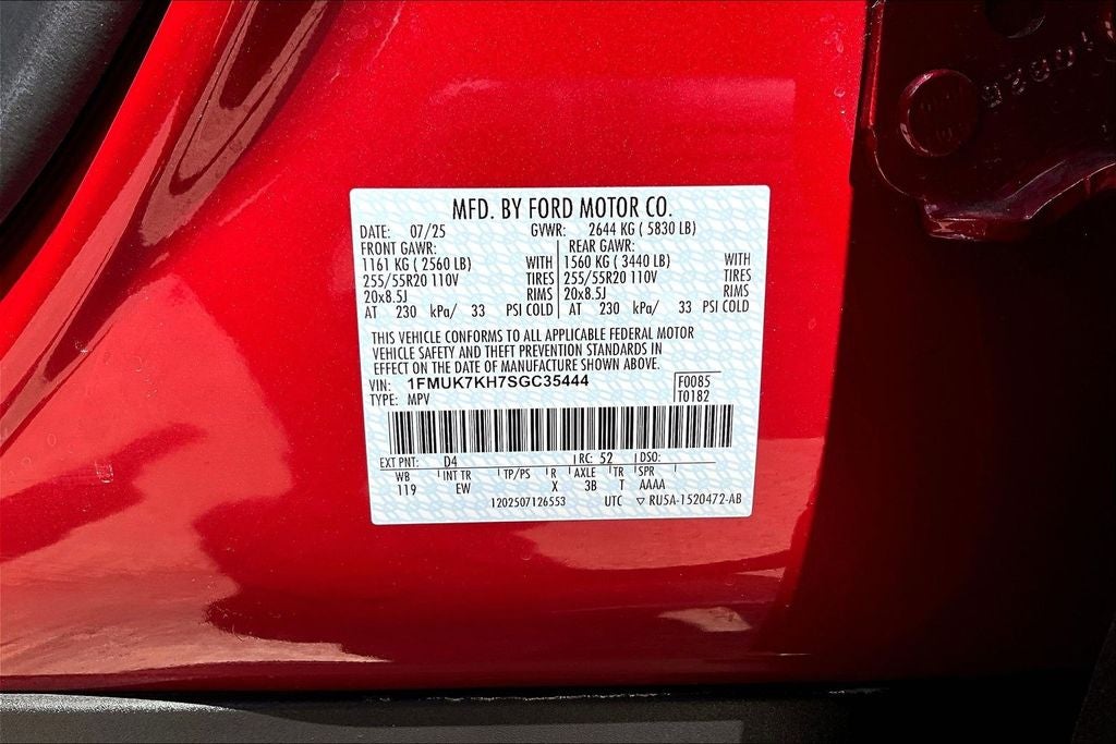 This 2025 Ford Explorer ST-Line in Red Metallic comes with the following features: 2.3L EcoBoost I-4 10-Speed Automatic RWD Equipment Group 300A Standard Package, 10 Speakers, 3.58 Non-Limited Slip Rear Axle, 3rd row seats: bench, 4-Wheel Disc Brakes, ABS brakes, Air Conditioning, Alloy wheels, AM/FM radio: SiriusXM with 360L, Apple CarPlay/Android Auto, Auto High-beam Headlights, Automatic temperature control, Brake assist, Bumpers: body-color, Compass, Delay-off headlights, Driver door bin, Driver vanity mirror, Dual front impact airbags, Dual front side impact airbags, Electronic Stability Control, Emergency communication system: 911 Assist, Exterior Parking Camera Rear, Four wheel independent suspension, Front anti-roll bar, Front Bucket Seats, Front Center Armrest, Front dual zone A/C, Front fog lights, Front License Plate Bracket, Front reading lights, Fully automatic headlights, Garage door transmitter, Heated door mirrors, Heated front seats, Heated steering wheel, Heated Unique Cloth Captain's Chairs, Illuminated entry, Internet access capable: FordPass Connect 5G, Knee airbag, Leather steering wheel, Low tire pressure warning, Navigation System, Occupant sensing airbag, Outside temperature display, Overhead airbag, Overhead console, Panic alarm, Passenger door bin, Passenger vanity mirror, Power door mirrors, Power driver seat, Power Liftgate, Power passenger seat, Power steering, Power windows, Radio: B&O Sound System by Bang & Olufsen, Rear air conditioning, Rear anti-roll bar, Rear reading lights, Rear window defroster, Rear window wiper, Remote keyless entry, Security system, Speed control, Speed-sensing steering, Speed-Sensitive Wipers, Split folding rear seat, Spoiler, Steering wheel mounted audio controls, Tachometer, Telescoping steering wheel, Tilt steering wheel, Traction control, Trip computer, Variably intermittent wipers, and Wheels: 20 Ebony-Painted Machined Aluminum.