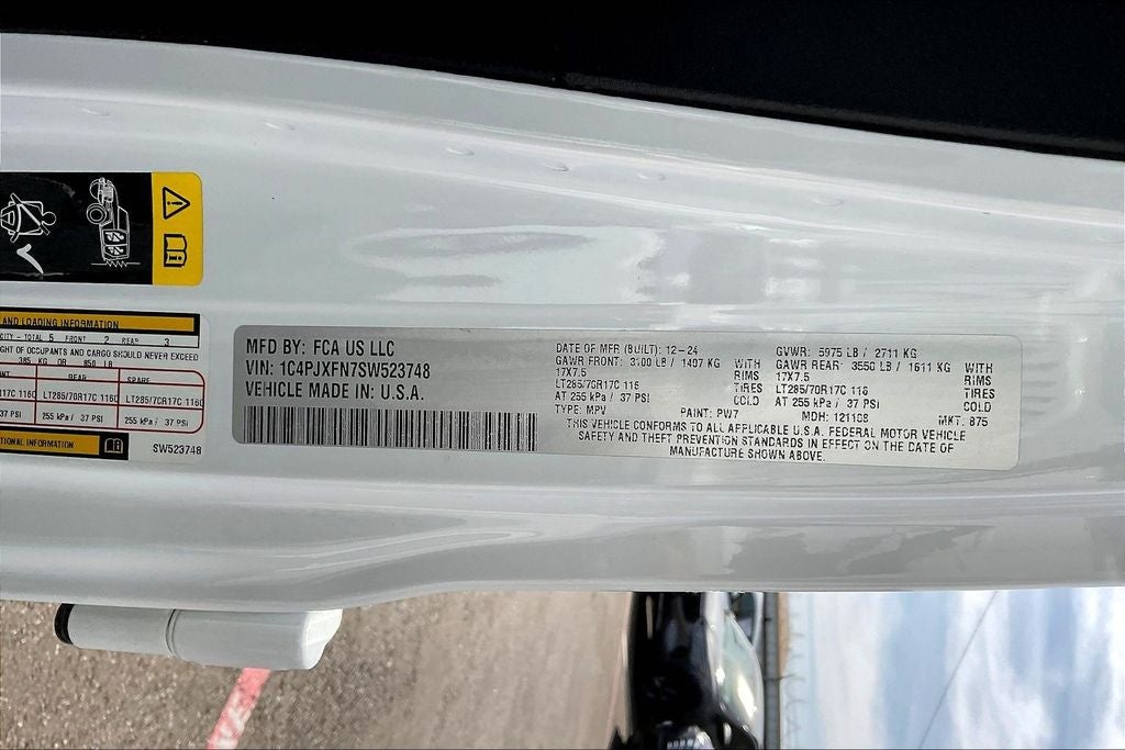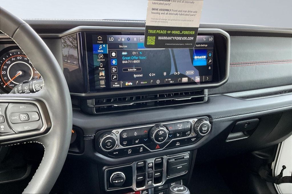 This 2025 Jeep Wrangler Rubicon in Bright White Clearcoat comes with the following features: 2.0L I4 DOHC 8-Speed Automatic 4WD Convenience Group (Heated Front Seats, Heated Steering Wheel, and Universal Garage Door Opener), Quick Order Package 22R Rubicon, 4-Wheel Disc Brakes, 4.10 Rear Axle Ratio, 4G LTE Wi-Fi Hot Spot, 8 Speakers, 97 MPH Vehicle Max Speed Calibration, ABS brakes, Air Conditioning, Alloy wheels, AM/FM radio: SiriusXM, Apple CarPlay, Apple CarPlay/Android Auto, Automatic temperature control, Aux Battery, Auxiliary Switches, Body Color 3-Piece Hard Top, Brake assist, Class II Receiver Hitch, Cloth Low-Back Bucket Seats, Compass, Connectivity - US/Canada, Delay-off headlights, Driver door bin, Driver vanity mirror, Dual front impact airbags, Dual front side impact airbags, Electronic Stability Control, Emergency communication system: Jeep Connect, Freedom Panel Storage Bag, Front anti-roll bar, Front Bucket Seats, Front Center Armrest w/Storage, Front dual zone A/C, Front fog lights, Front License Plate Bracket (DISC), Front reading lights, Fully automatic headlights, Google Android Auto, Heated door mirrors, Illuminated entry, Integrated roll-over protection, Low tire pressure warning, Non-Lock Fuel Cap w/o Discriminator, Occupant sensing airbag, Outside temperature display, Overhead airbag, Panic alarm, ParkView Rear Back-Up Camera, Passenger door bin, Passenger vanity mirror, Performance Suspension, Power door mirrors, Power steering, Power windows, Radio data system, Radio: Uconnect 5 w/12.3 Display, Rear anti-roll bar, Rear reading lights, Rear Window Defroster, Rear Window Wiper/Washer, Remote keyless entry, Security system, Speed control, Split folding rear seat, Steering wheel mounted audio controls, Stop-Start Dual Battery System, Tachometer, Telescoping steering wheel, Tilt steering wheel, Traction control, Trip computer, Variably intermittent wipers, Voltmeter, and Wheels: 17 x 7.5 Machined/Painted Black.