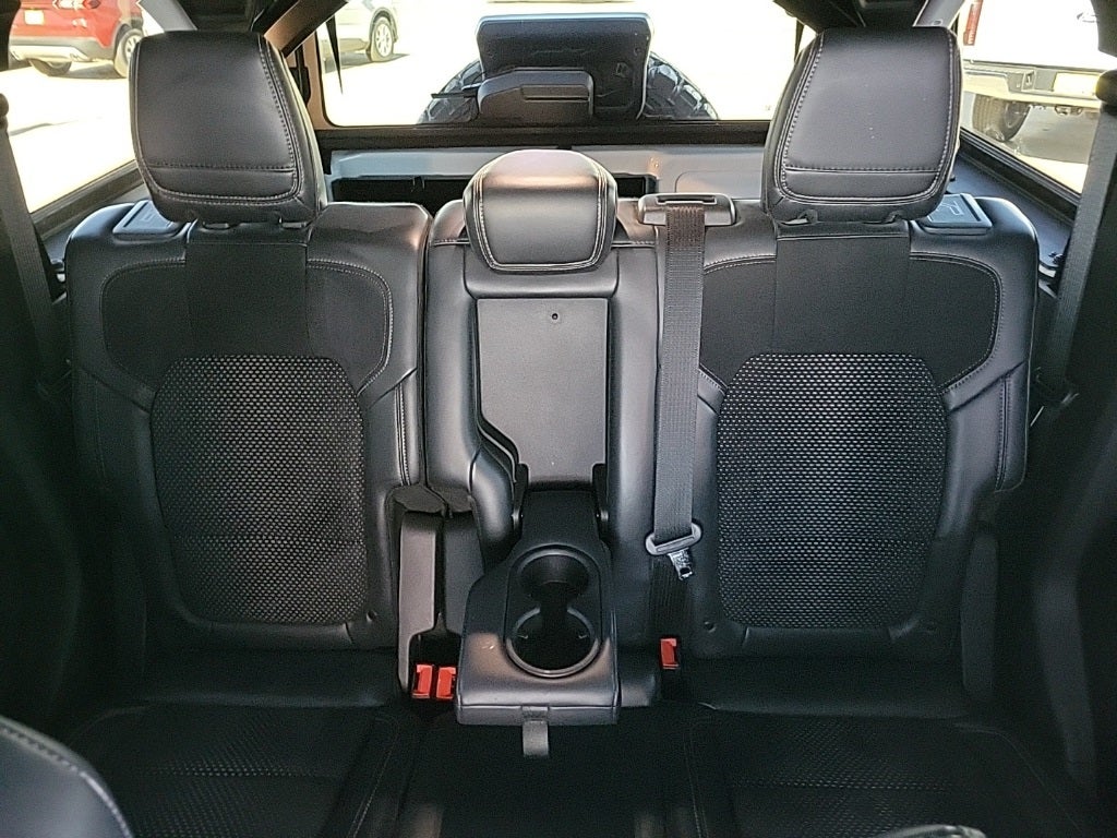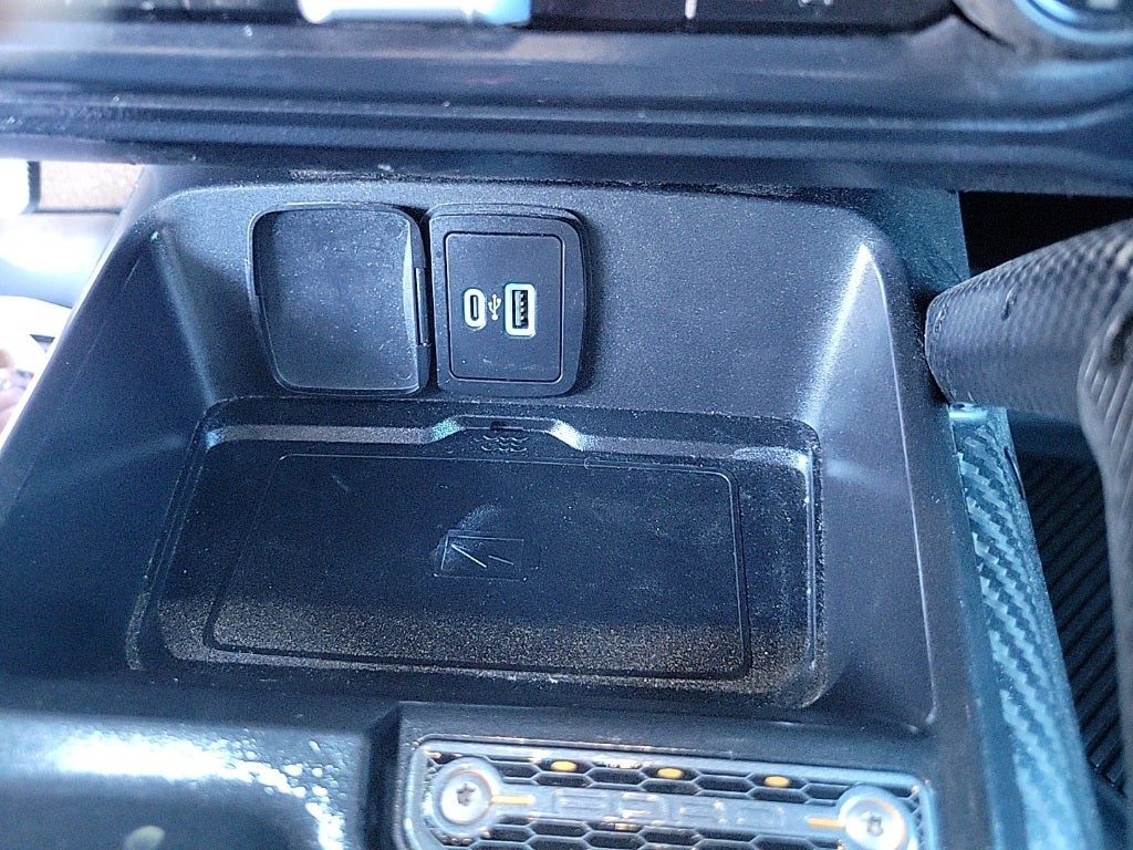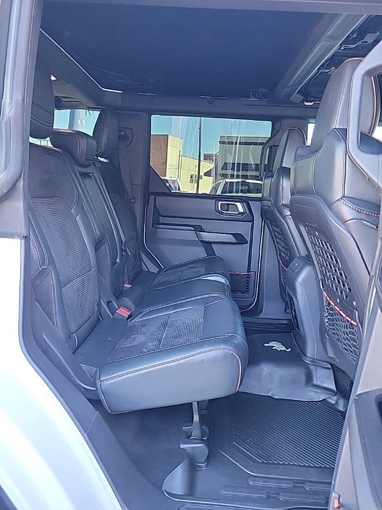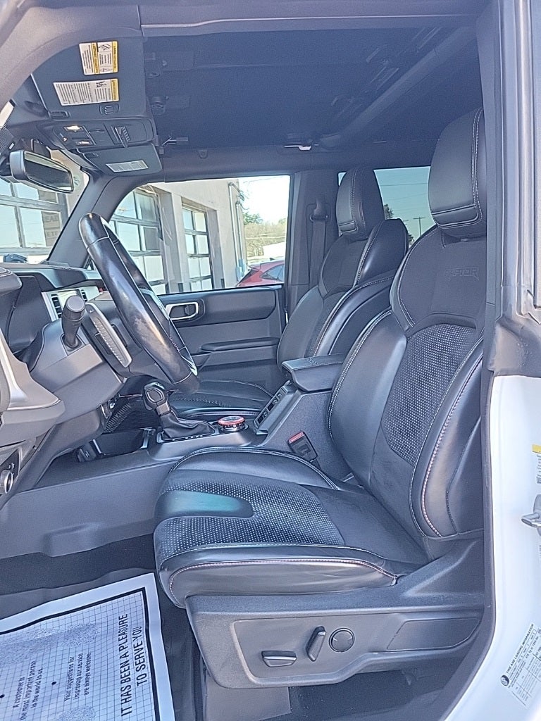 This 2023 Ford Bronco Raptor in Oxford White comes with the following features: 3.0L EcoBoost V6 10-Speed Automatic 4WD Equipment Group 374A Lux Package, Lux Package (10 Speakers w/Subwoofer, 2 Smart Charging USB Ports In Dashboard, Adaptive Cruise Control, Connected Built-In Navigation, Evasive Steering Assist, Heated Steering Wheel, Radio: B&O Sound System by Bang & Olufsen, Universal Garage Door Opener, and Wireless Charging Pad), 4-Wheel Disc Brakes, 4.7 Axle Ratio, 7 Speakers, ABS brakes, Air Conditioning, Alloy wheels, AM/FM radio: SiriusXM with 360L, AM/FM Stereo, Auto High-beam Headlights, Auto-dimming Rear-View mirror, Automatic temperature control, Brake assist, Compass, Connected Navigation, Convertible HardTop, Convertible roof lining, Delay-off headlights, Driver door bin, Driver vanity mirror, Dual front impact airbags, Dual front side impact airbags, Electronic Stability Control, Emergency communication system: 911 Assist, Exterior Parking Camera Rear, Front anti-roll bar, Front Bucket Seats, Front Center Armrest, Front dual zone A/C, Front fog lights, Front reading lights, Front wheel independent suspension, Fully automatic headlights, Glass rear window, Hard Top Sound Deadening Headliner (DISC), Heated door mirrors, Heated front seats, Illuminated entry, Integrated roll-over protection, Interior Carbon Fiber Pack 6, Keyless Entry Keypad, Leather Shift Knob, Low tire pressure warning, Marine Grade Vinyl Bucket Seats, Navigation system: Connected Navigation, Occupant sensing airbag, Outside temperature display, Overhead airbag, Overhead console, Panic alarm, Passenger door bin, Passenger vanity mirror, Power door mirrors, Power steering, Power windows, Radio data system, Rear anti-roll bar, Rear seat center armrest, Rear window defroster, Rear window wiper, Remote keyless entry, Security system, SiriusXM Radio w/360L, Speed control, Split folding rear seat, Steering wheel mounted audio controls, SYNC 4, Tachometer, Telescoping steering wheel, Tilt steering wheel, Traction control, Trip computer, Turn signal indicator mirrors, Variably intermittent wipers, Voltmeter, and Wheels: 17 Black High Gloss-Painted Aluminum.
