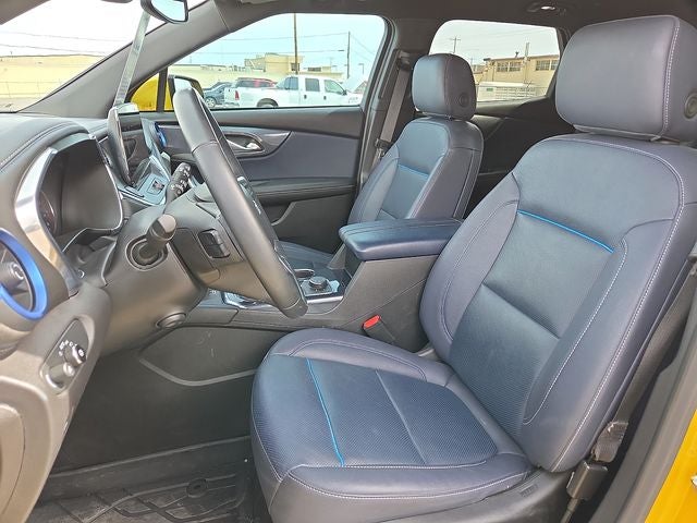 This 2024 Chevrolet Blazer RS in Nitro Yellow Metallic comes with the following features: 3.6L V6 SIDI 9-Speed Automatic with Overdrive AWD Enhanced Convenience Package (Heated Rear Outboard Seating Positions, Memory Settings For Driver Seat & Exterior Mirrors, Power Tilt & Telescoping Steering Column, and Ventilated Driver & Front Passenger Seats), Floor Liner Package (LPO) (1st & 2nd Row All-Weather Floor Liners (LPO) and Integrated Cargo Liner (LPO)), Preferred Equipment Group 1RS (Heated Steering Wheel), AWD, 3.49 Final Drive Axle Ratio, 4-Wheel Disc Brakes, 6-Way Power Front Passenger Seat Adjuster, 8 Speakers, 8-Way Power Driver Seat Adjuster, ABS brakes, Air Conditioning, Alloy wheels, AM/FM radio: SiriusXM with 360L, Apple CarPlay/Android Auto, Auto High-beam Headlights, Auto-dimming door mirrors, Auto-dimming Rear-View mirror, Automatic temperature control, Black 2-Tone Roof, Bose Premium 8-Speaker Audio System Feature, Brake assist, Bumpers: body-color, Child-Seat-Sensing Airbag, Compass, Delay-off headlights, Driver door bin, Driver vanity mirror, Dual front impact airbags, Dual front side impact airbags, Electronic Stability Control, Emergency communication system: OnStar and Chevrolet connected services capable, Four wheel independent suspension, Front anti-roll bar, Front Bucket Seats, Front Center Armrest, Front dual zone A/C, Front reading lights, Fully automatic headlights, Garage door transmitter, Heated door mirrors, Heated Driver & Front Passenger Seats, Heated front seats, Heated steering wheel, Illuminated entry, Knee airbag, Leather Shift Knob, Leather steering wheel, Low tire pressure warning, Navigation System, Occupant sensing airbag, Outside temperature display, Overhead airbag, Overhead console, Panic alarm, Passenger door bin, Passenger vanity mirror, Perforated Leather-Appointed Seat Trim, Power door mirrors, Power Driver Lumbar Control, Power driver seat, Power Liftgate, Power Panoramic Tilt-Sliding Sunroof, Power passenger seat, Power steering, Power windows, Premium audio system: Chevrolet Infotainment 3 Premium, Radio data system, Radio: Chevrolet Infotainment 3 Premium System, Rear anti-roll bar, Rear reading lights, Rear seat center armrest, Rear window defroster, Rear window wiper, Remote keyless entry, Ride & Handling Suspension, Security system, SiriusXM w/360L, Speed control, Speed-sensing steering, Split folding rear seat, Spoiler, Steering wheel mounted audio controls, Tachometer, Telescoping steering wheel, Tilt steering wheel, Traction control, Trip computer, Turn signal indicator mirrors, Variably intermittent wipers, Voltmeter, Wheels: 20 Gloss Black Aluminum, and Wheels: 20 Technical Gray Aluminum.